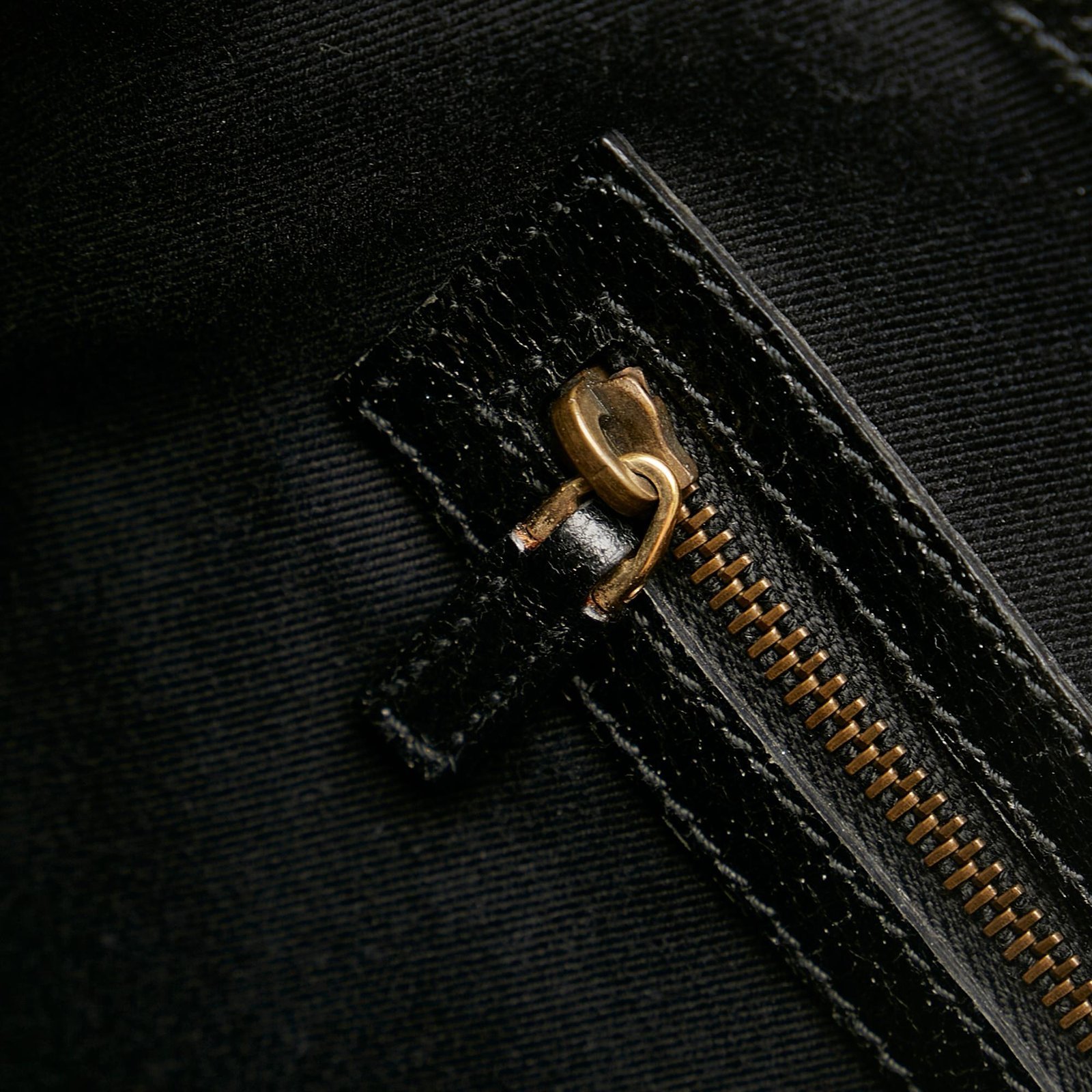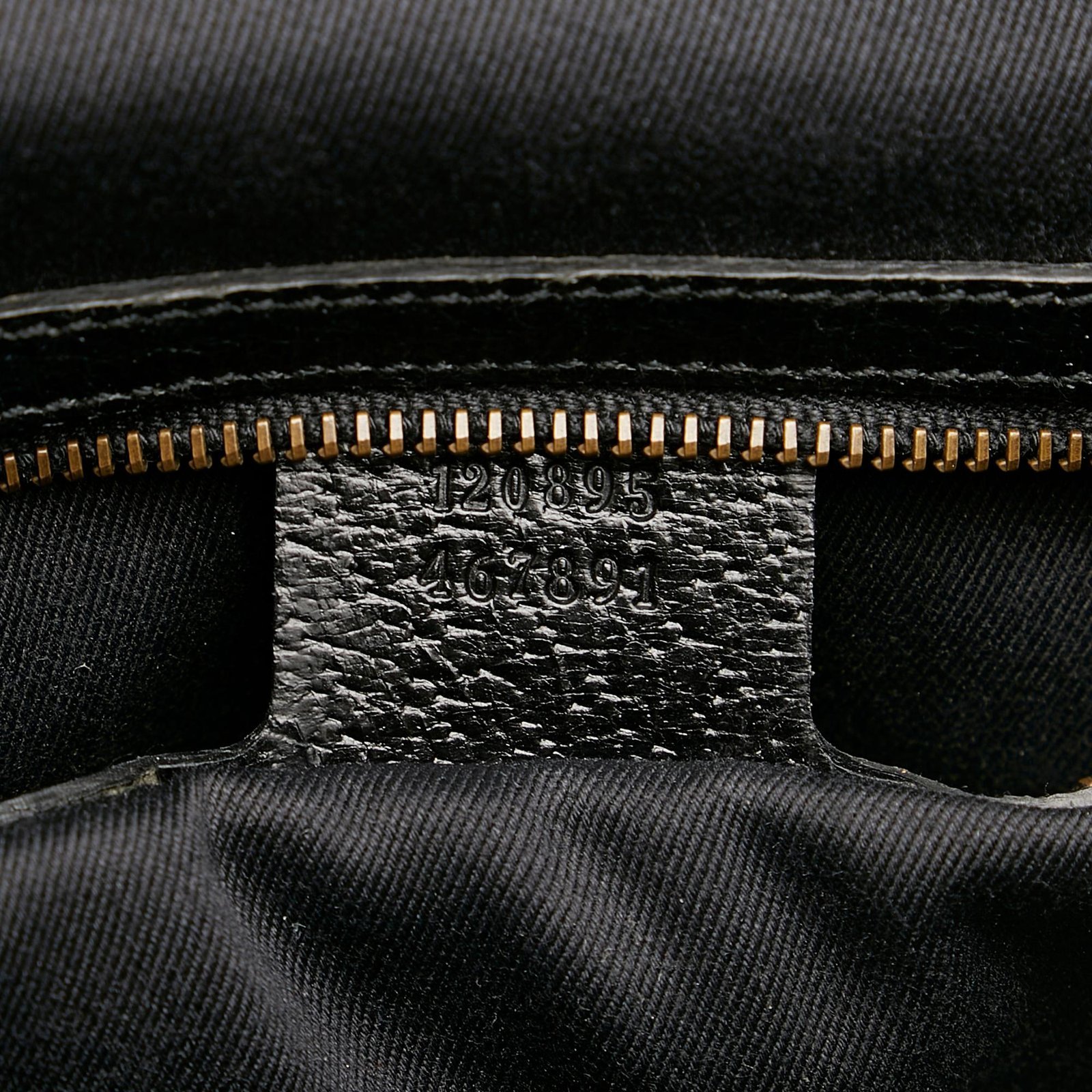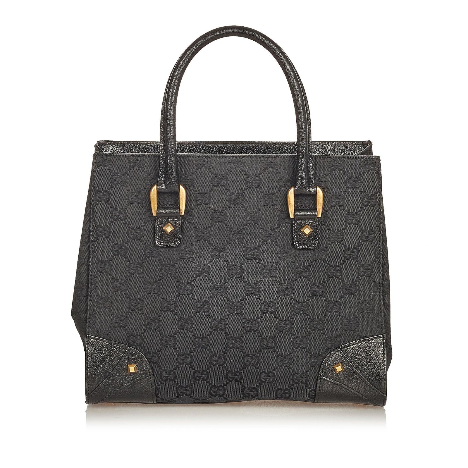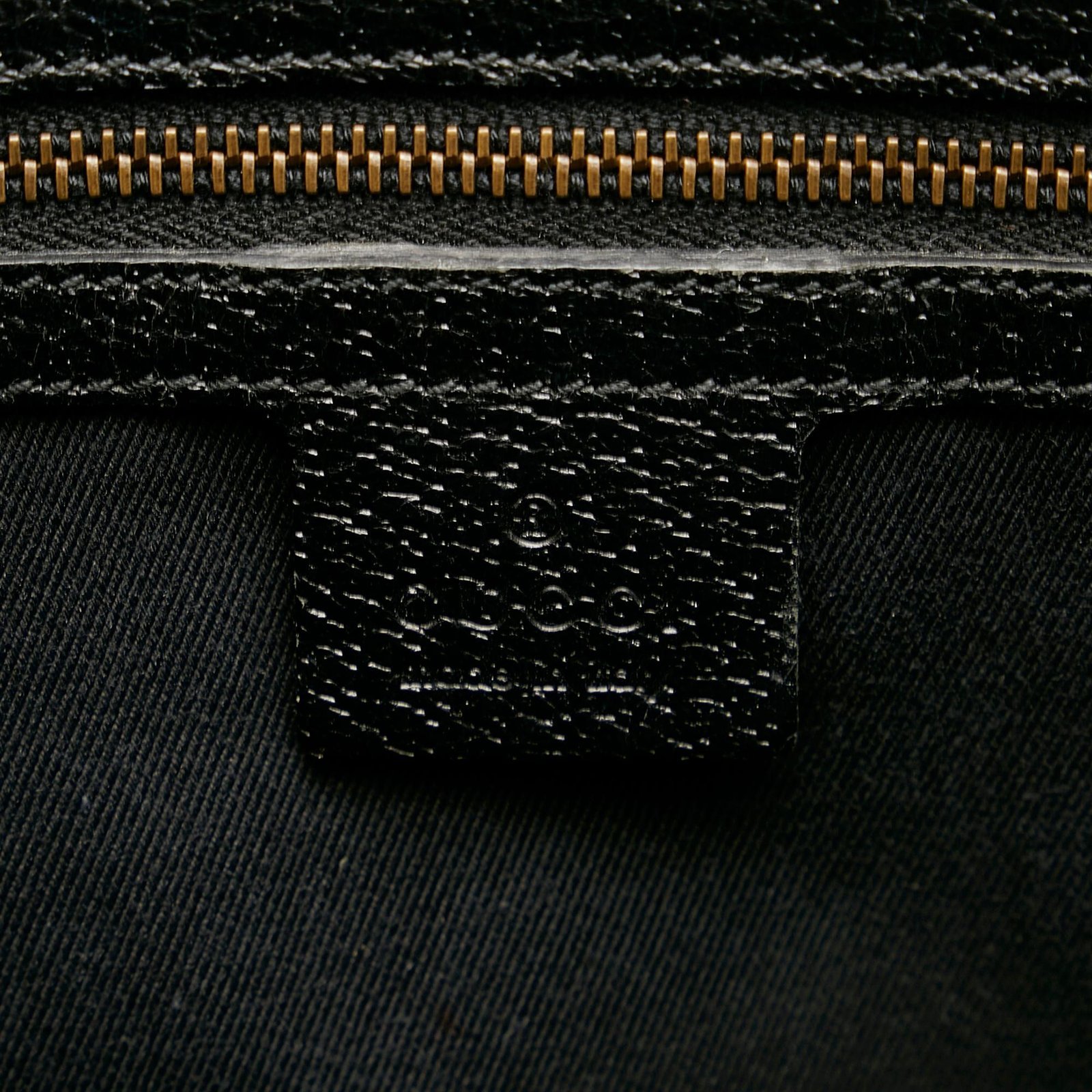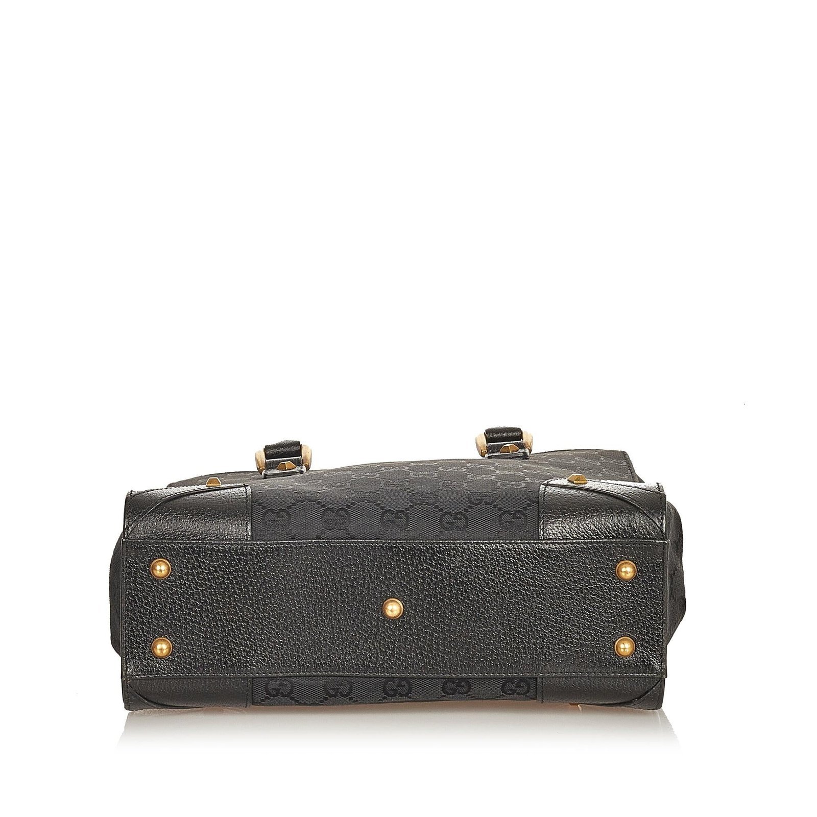 This chic Gucci handbag is crafted from black GG canvas and accented with gold-tone nailhead hardware, creating a striking and sophisticated look. Designed for everyday use, it features a spacious interior to keep essentials organized while maintaining a sleek silhouette.