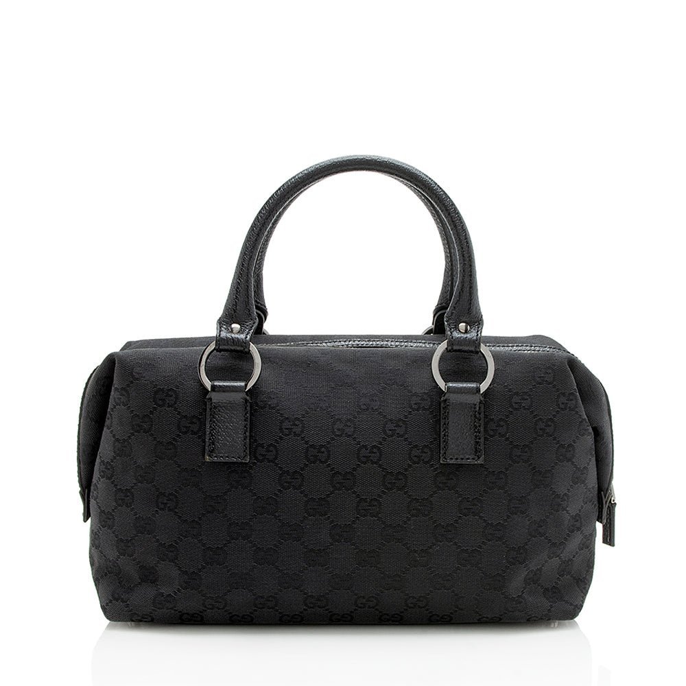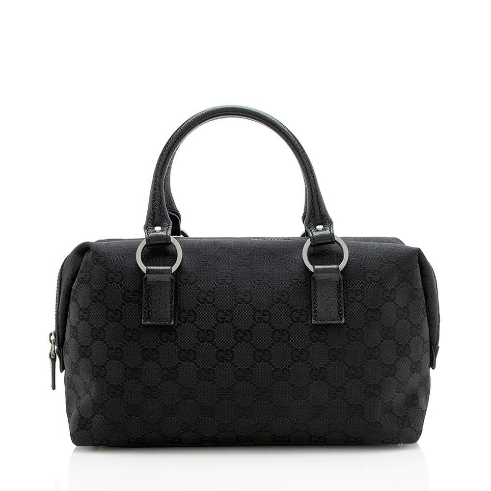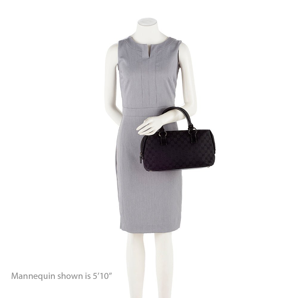 The Gucci GG Canvas Small Satchel is a sophisticated and versatile accessory that reflects Gucci’s timeless design and Italian craftsmanship. Crafted from signature GG canvas in classic black with refined leather trim, this Boston-style bag features rolled leather handles for comfortable handheld carry. The top zip closure opens to a well organized interior with a zip pocket, combining elegance with practical functionality for daily use.