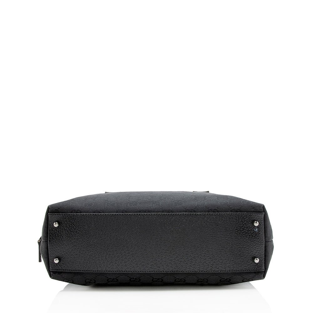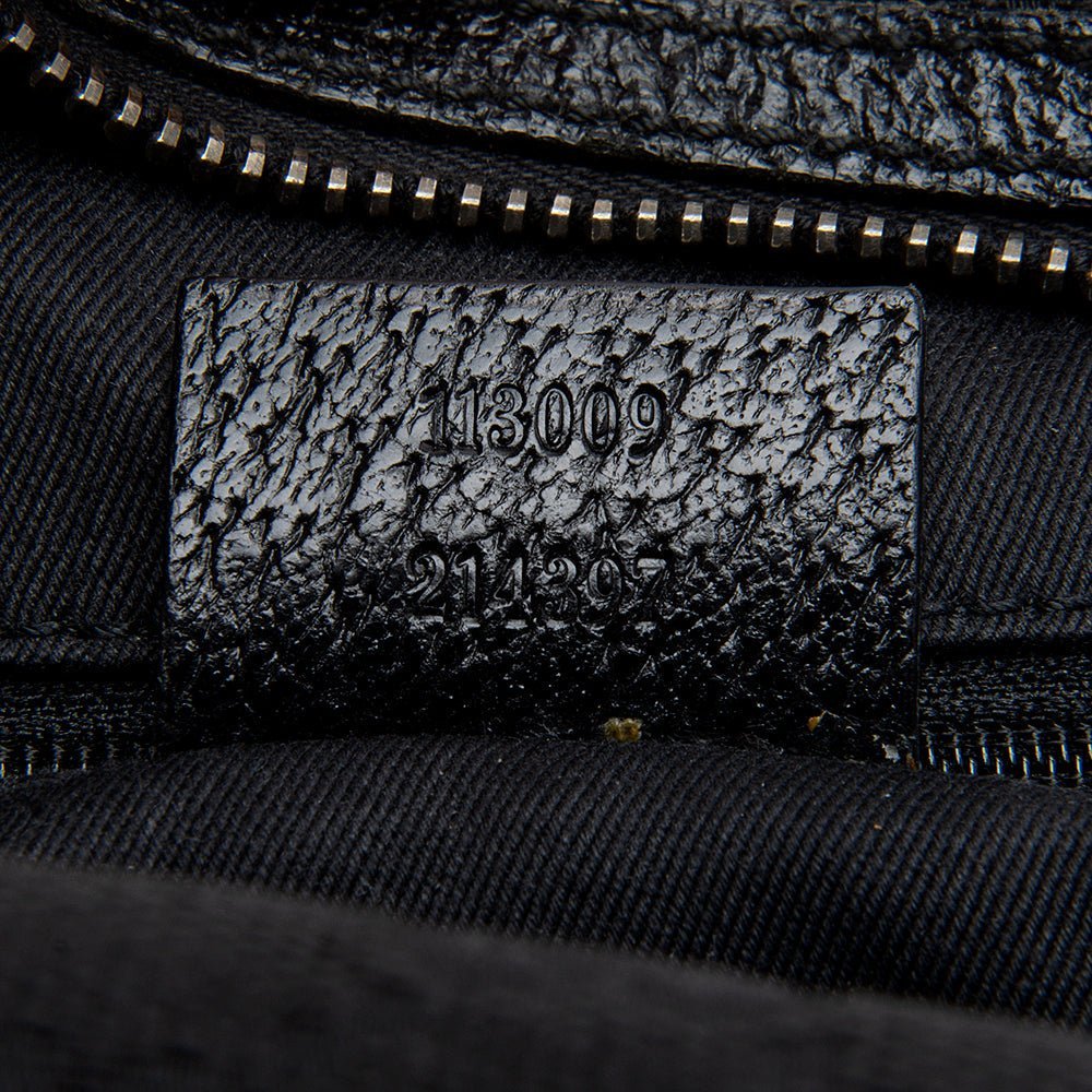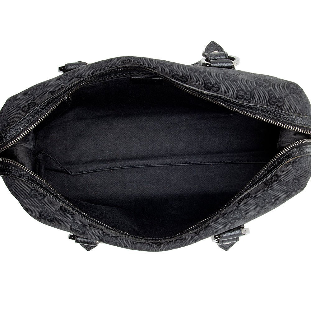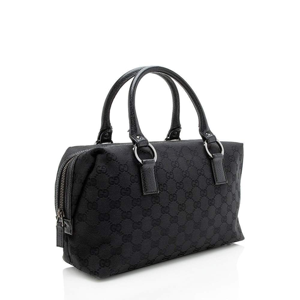 The Gucci GG Canvas Small Satchel is a sophisticated and versatile accessory that reflects Gucci’s timeless design and Italian craftsmanship. Crafted from signature GG canvas in classic black with refined leather trim, this Boston-style bag features rolled leather handles for comfortable handheld carry. The top zip closure opens to a well organized interior with a zip pocket, combining elegance with practical functionality for daily use.