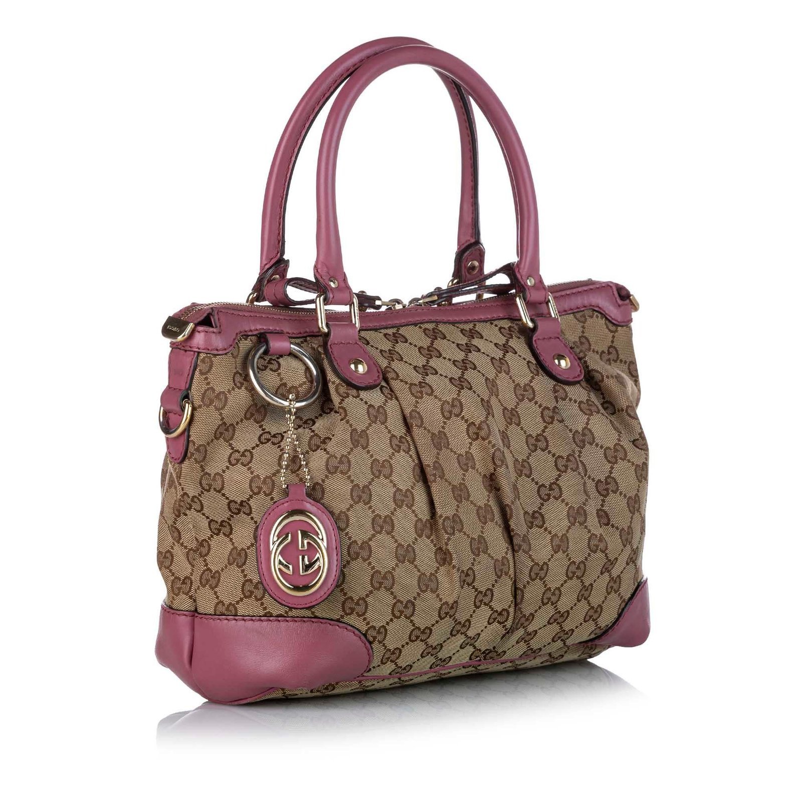 The Gucci GG Canvas Sukey Satchel is a stylish and versatile bag that embodies Gucci’s iconic design and Italian craftsmanship. Crafted from signature GG canvas in elegant brown, beige, and pink tones with leather and calfskin accents, this satchel features rolled leather handles and a flat shoulder strap for comfortable carry. The top zip closure opens to a well organized interior with a zip pocket, combining sophisticated style with practical functionality.