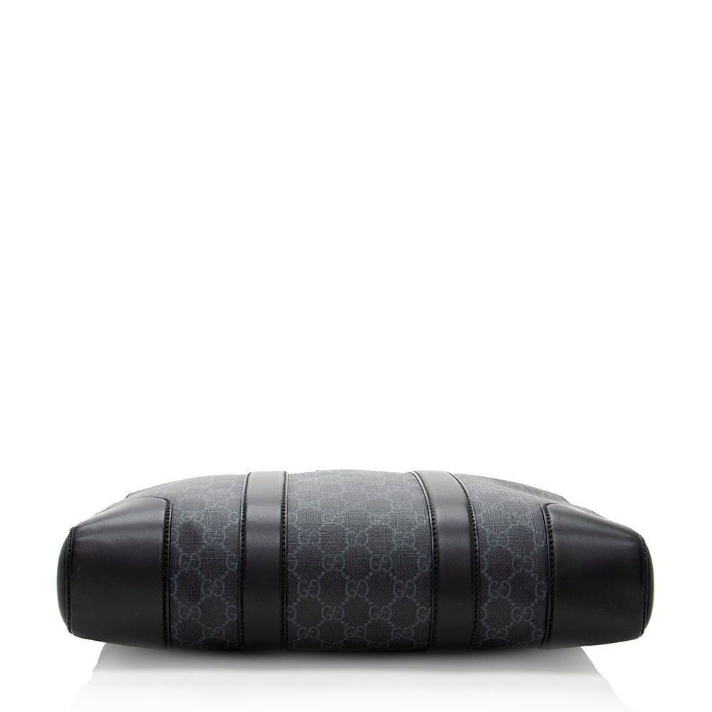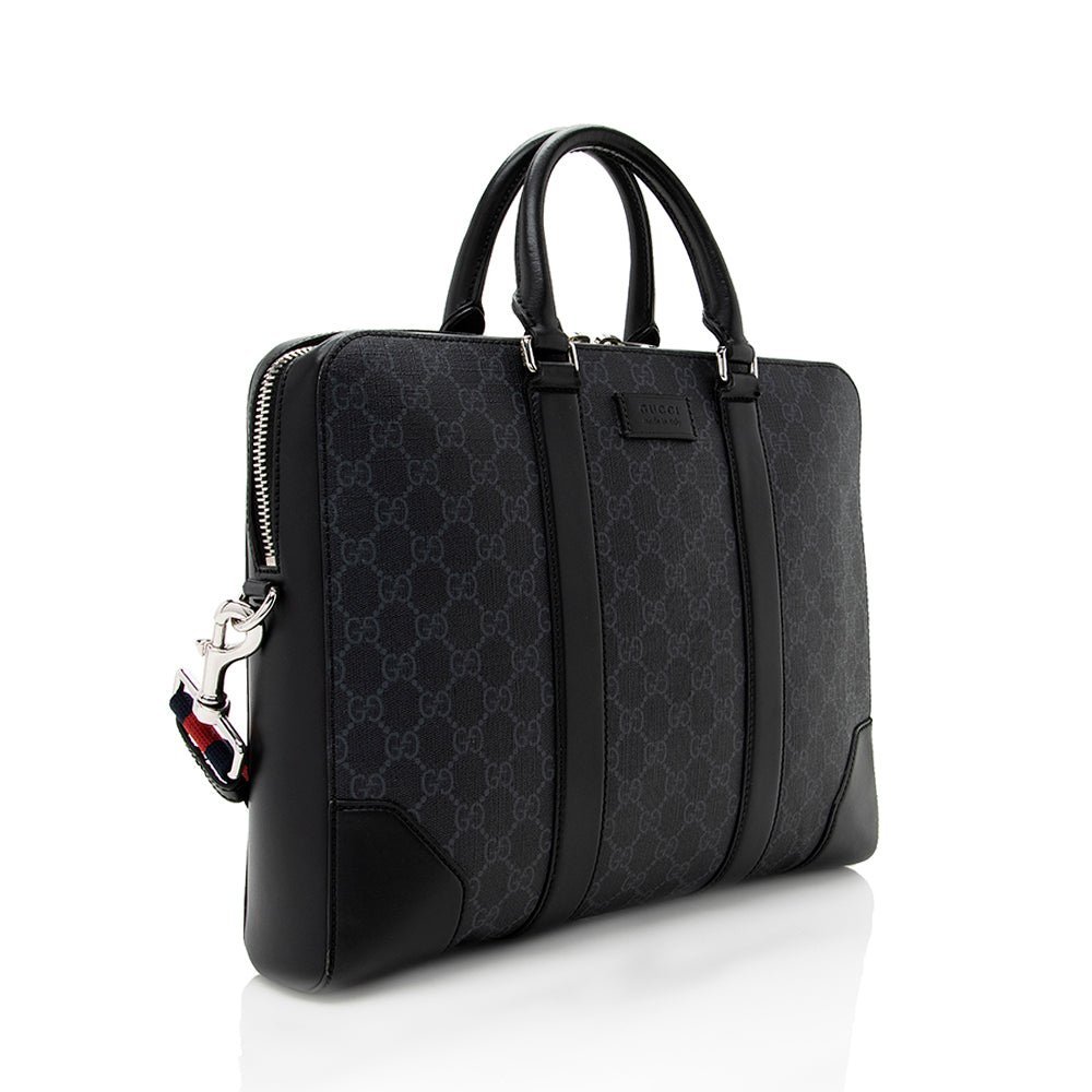 The signature GG Supreme canvas remains an evergreen of the House thanks to its soft and malleable qualities. Crafted from a coated microfiber fabric, here it appears in an all black variation to define this briefcase. A tonal leather trim completes the style, while a pop of colour appears in the form of the archival Web stripe.