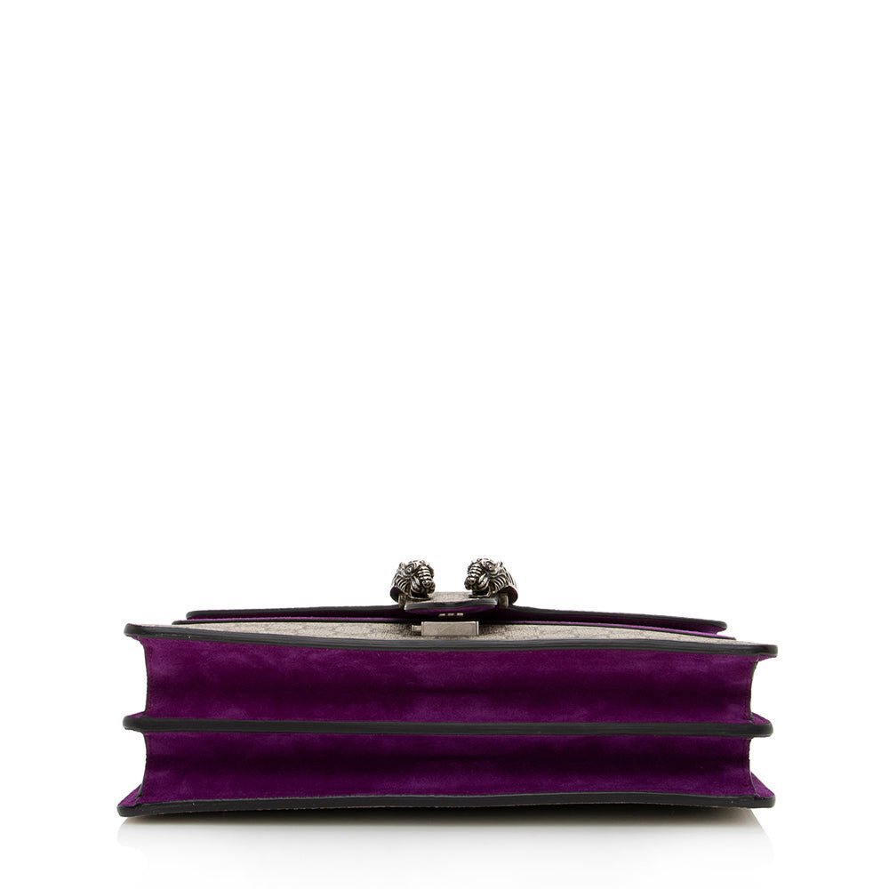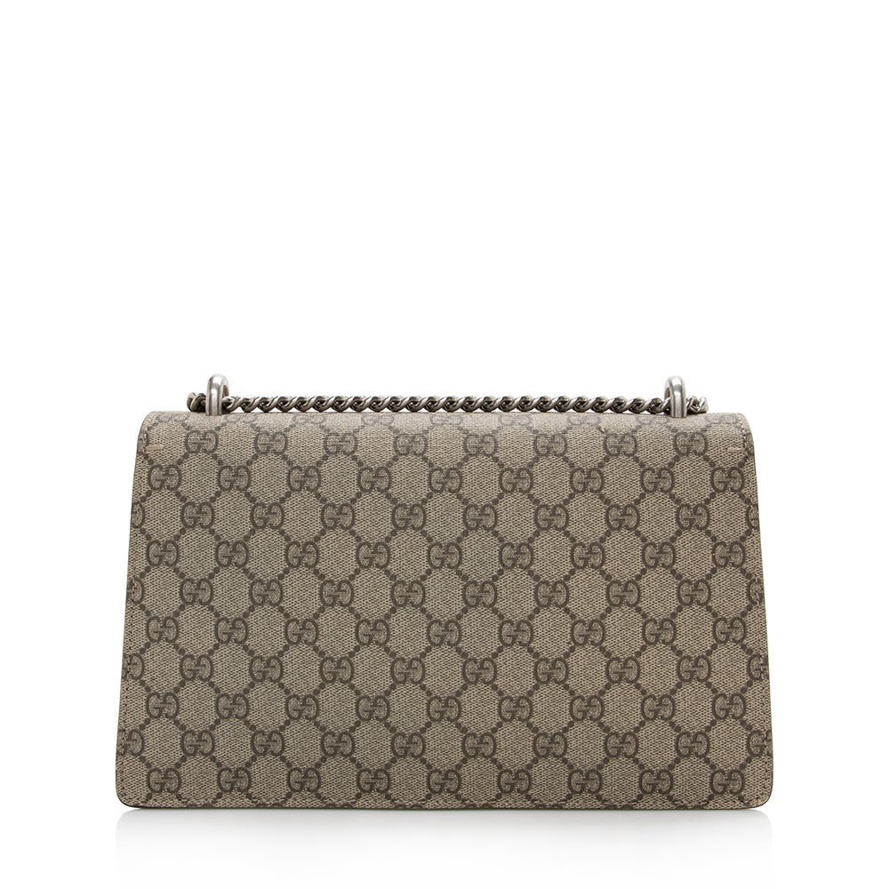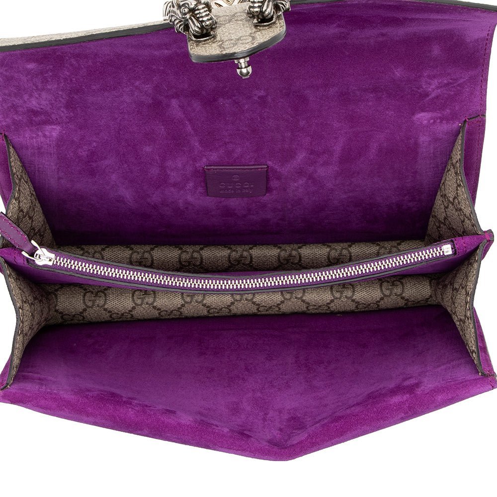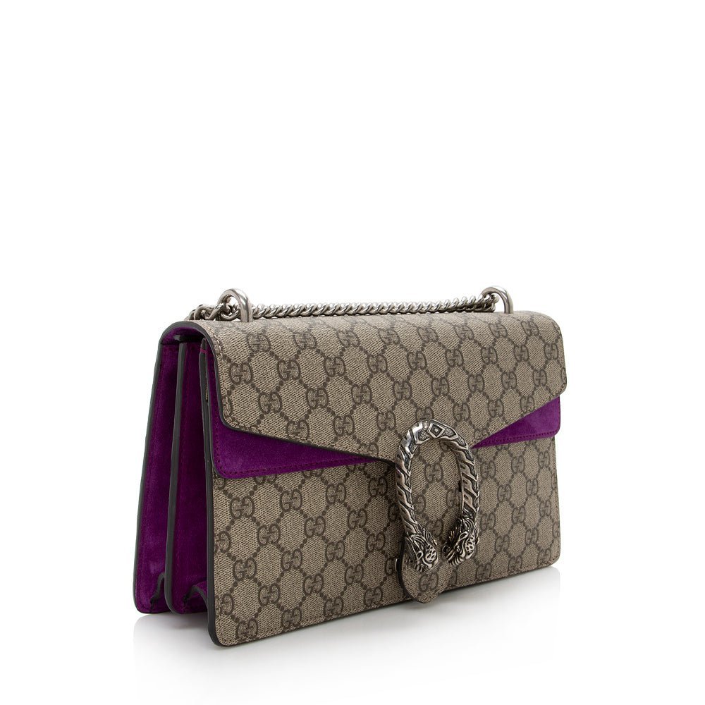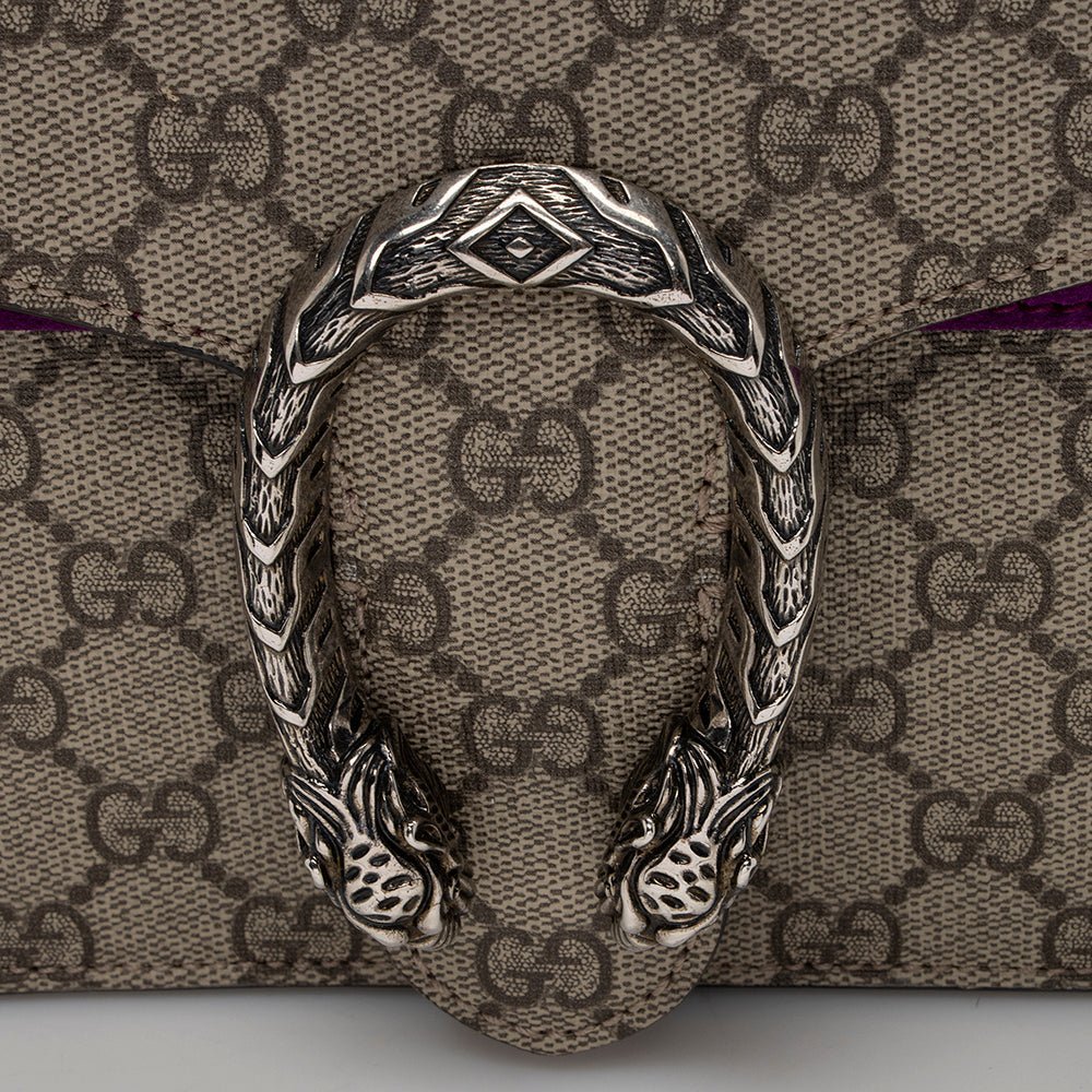 A structured GG Supreme canvas chain mini shoulder bag with a key ring that can be used to attach this bag to a separate larger bag. The closure has the textured tiger head spur closure-a unique detail referencing the Greek god Dionysus, who in myth is said to have crossed the river Tigris on a tiger sent to him by Zeus. The accessory can also be worn as a crossbody bag.