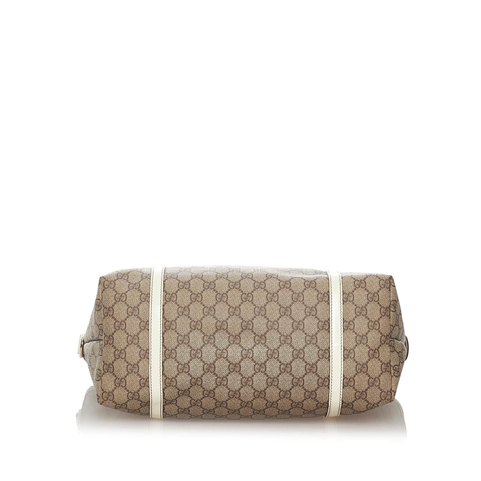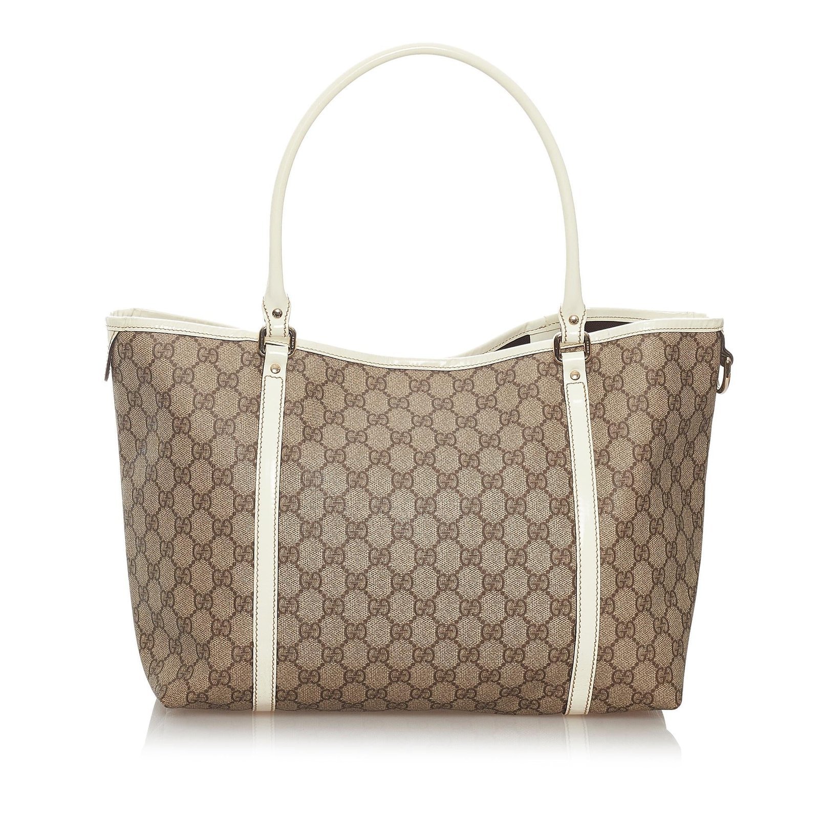The Gucci GG Supreme Joy Tote Bag is a stylish and versatile accessory crafted from iconic GG Supreme coated canvas with leather trim. It features rolled leather straps, a magnetic snap button closure, and interior zip and slip pockets for effortless organization.