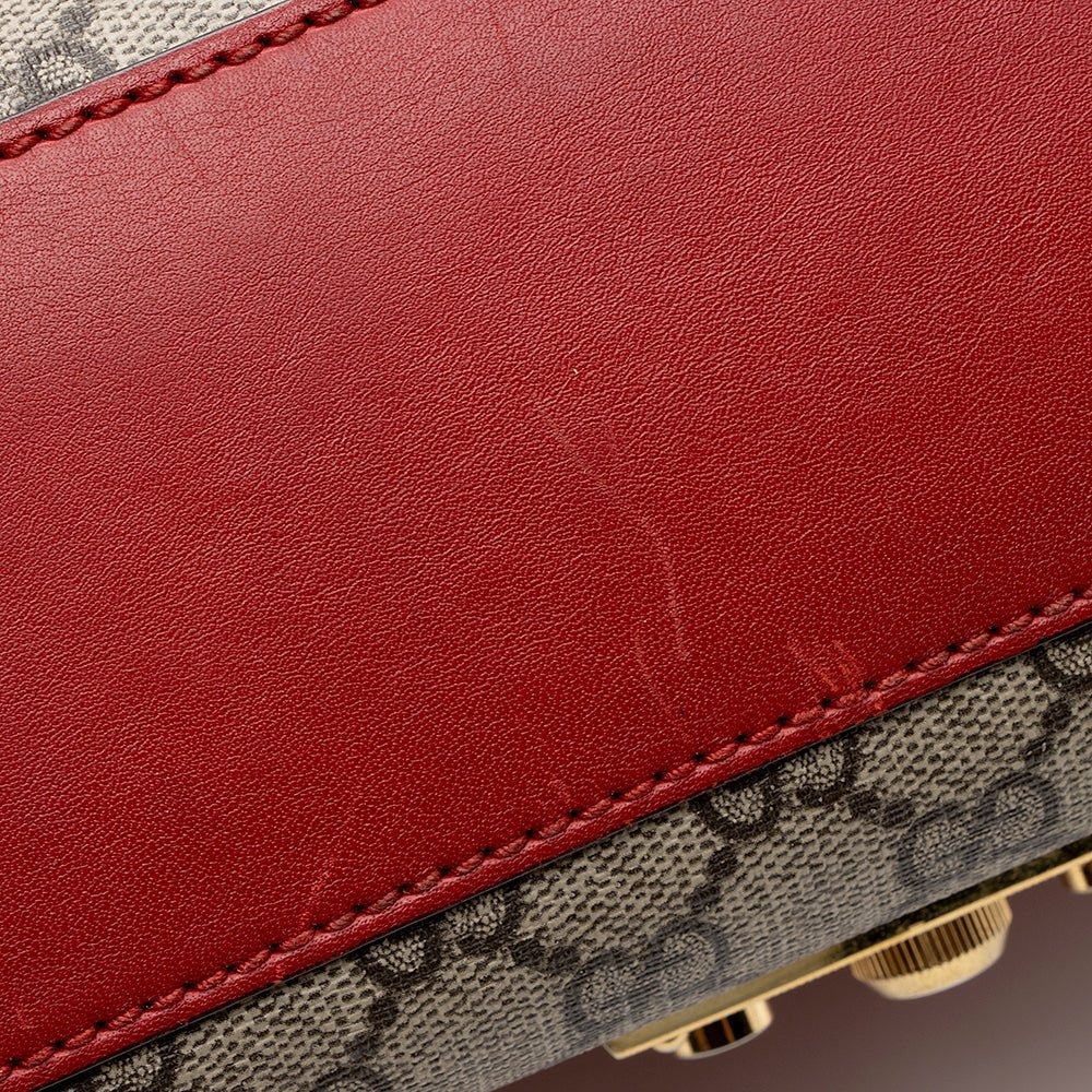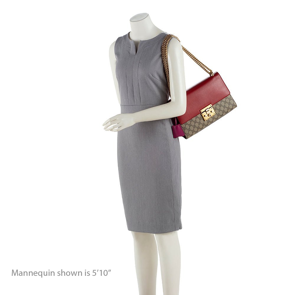 This elegant shoulder bag from Gucci features the iconic GG Supreme coated canvas paired with leather trim and gold-tone hardware. Its structured flap design is secured with a signature push-lock closure, while a clochette with keys adds a refined touch. The bag includes one exterior pocket and three interior pockets for organized storage.