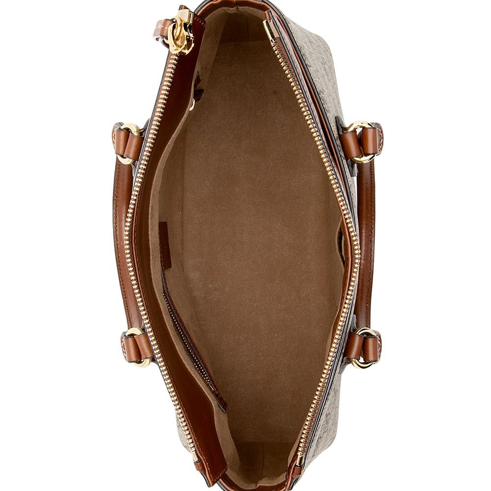 The tote offers a structured silhouette with a top zip closure and gold-tone hardware for a polished look. A comfortable handle allows for handheld carry, while the interior includes three pockets to organize essentials such as a wallet, phone, keys, sunglasses, and small cosmetics. An exterior pocket provides convenient access for quick-use items.