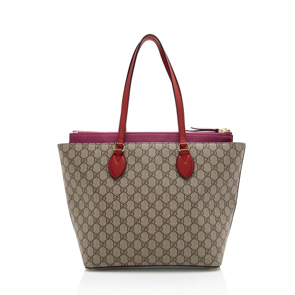 The Gucci GG Supreme Zip Tote is a chic and versatile accessory that combines iconic design with everyday practicality. Crafted from Gucci’s signature GG Supreme coated canvas, this tote features a playful and stylish color palette of khaki, pink, and red, making it a standout addition to any wardrobe.