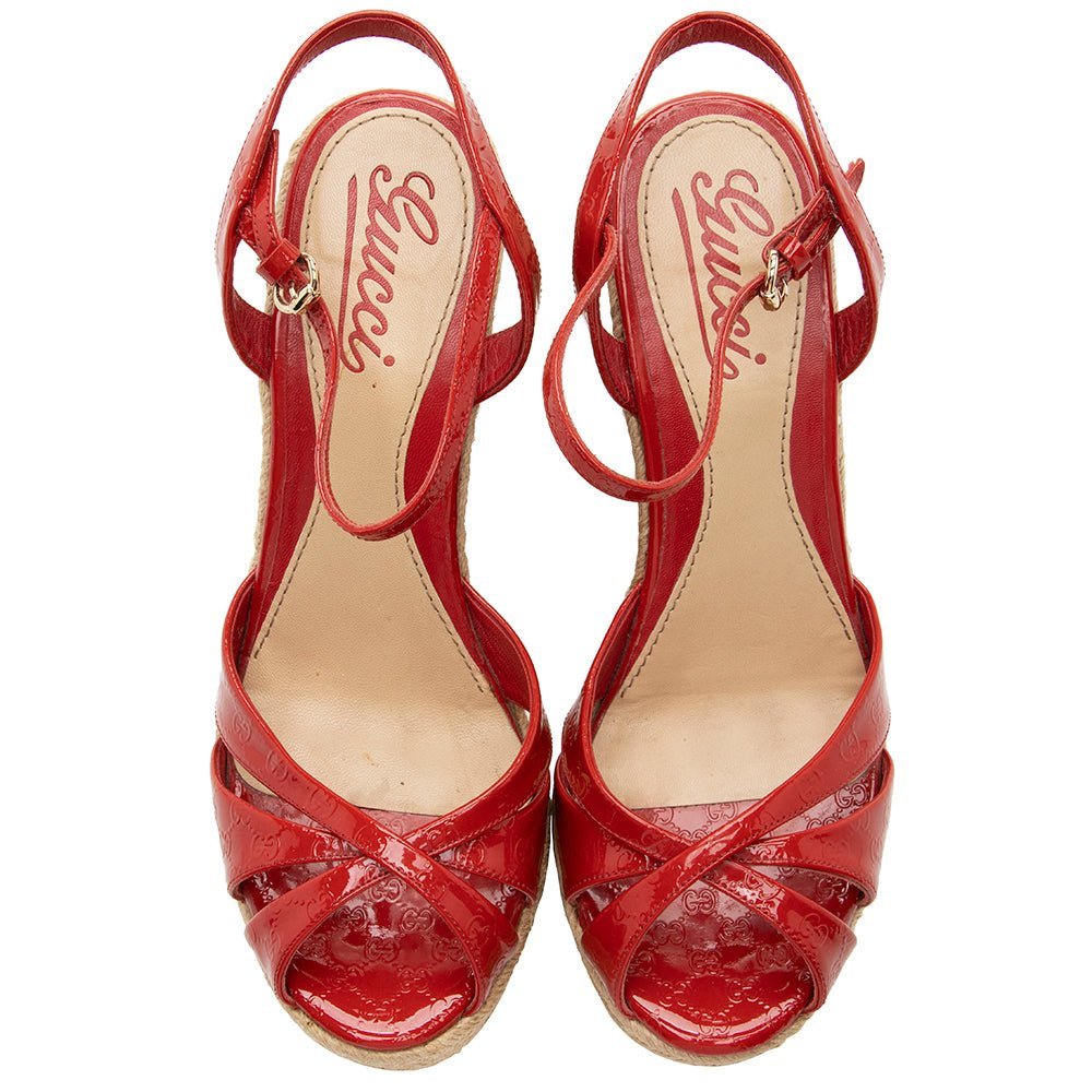 Step into effortless elegance with the Gucci Guccissima Patent Strappy Espadrille Wedges. Crafted in Spain from luxurious micro Guccissima patent leather, these sandals feature a vibrant red finish complemented by gold-tone hardware accents. The design combines high fashion with comfort, making them ideal for both casual outings and sophisticated occasions.
