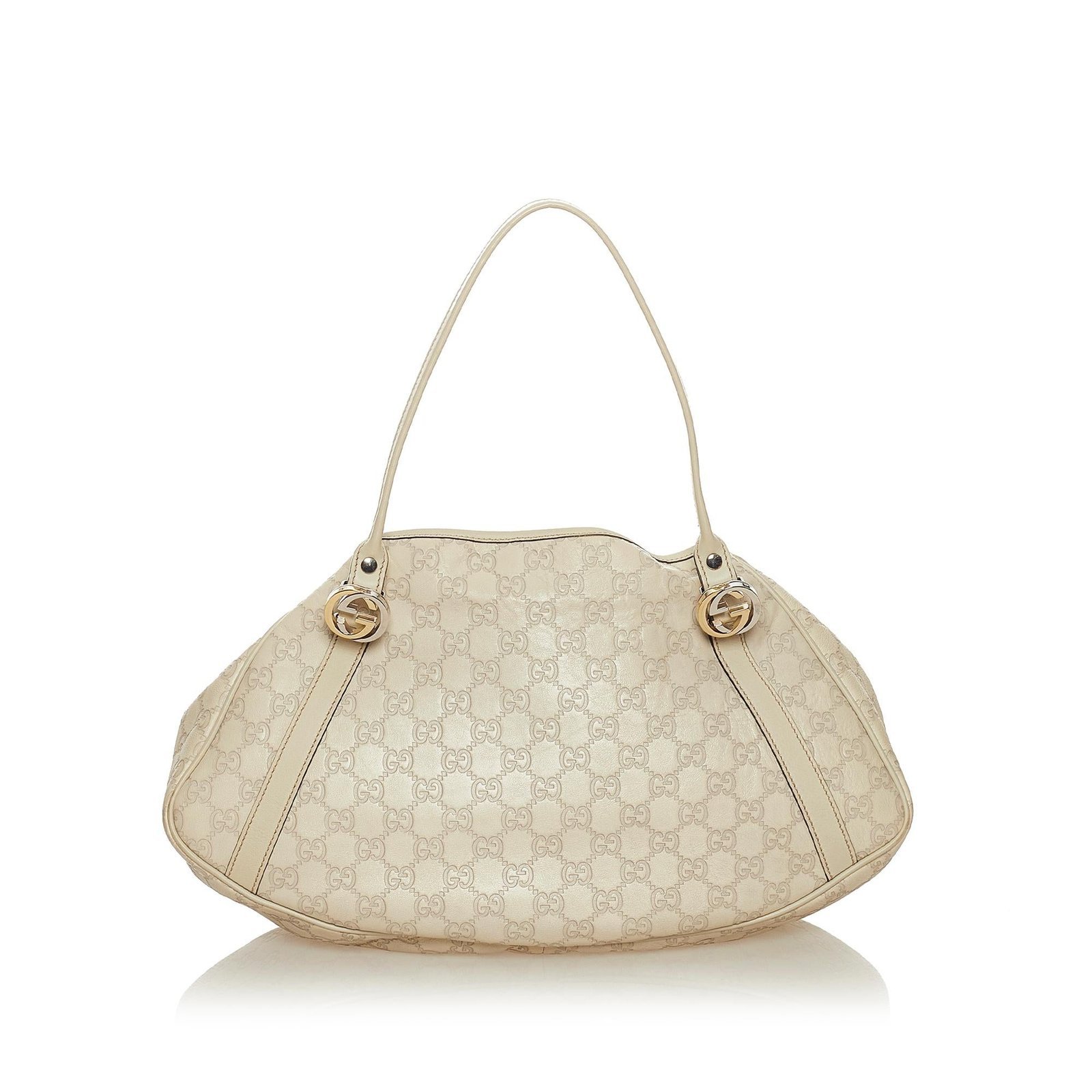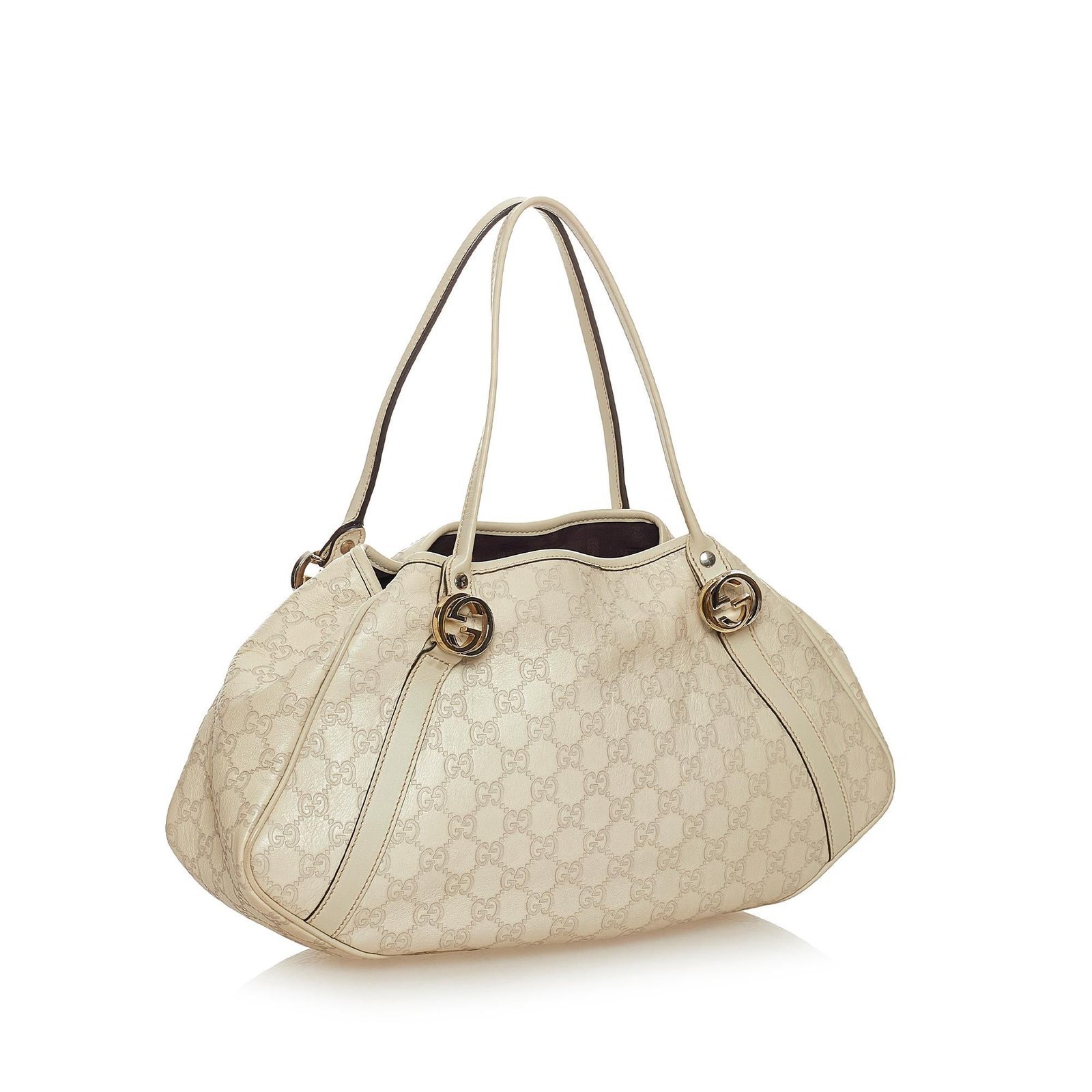 The Gucci Guccissima Twin Tote Bag is crafted from luxurious white Guccissima embossed leather. It features flat leather straps, an open top with a leather lock strap, and interior zip and slip pockets for organized storage.