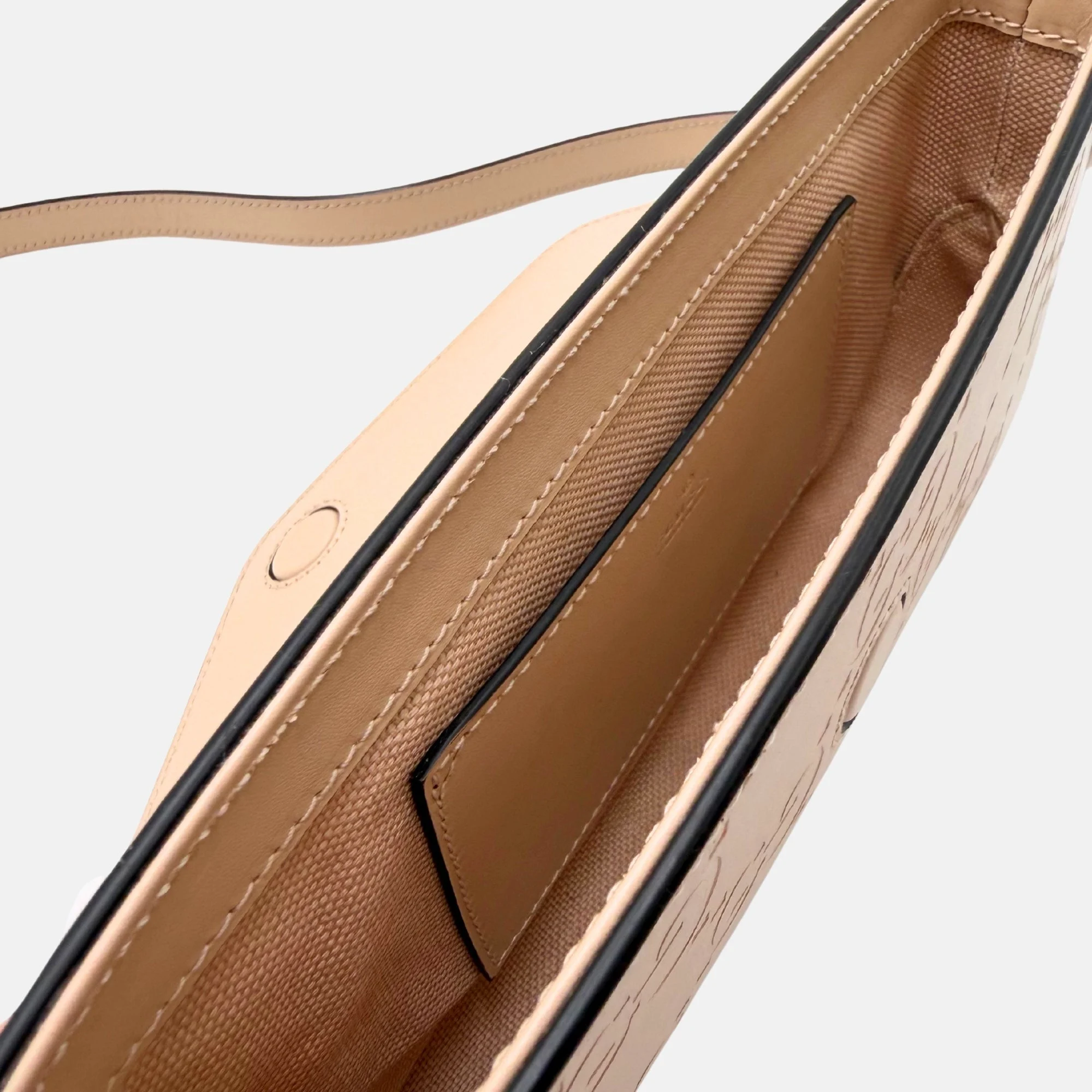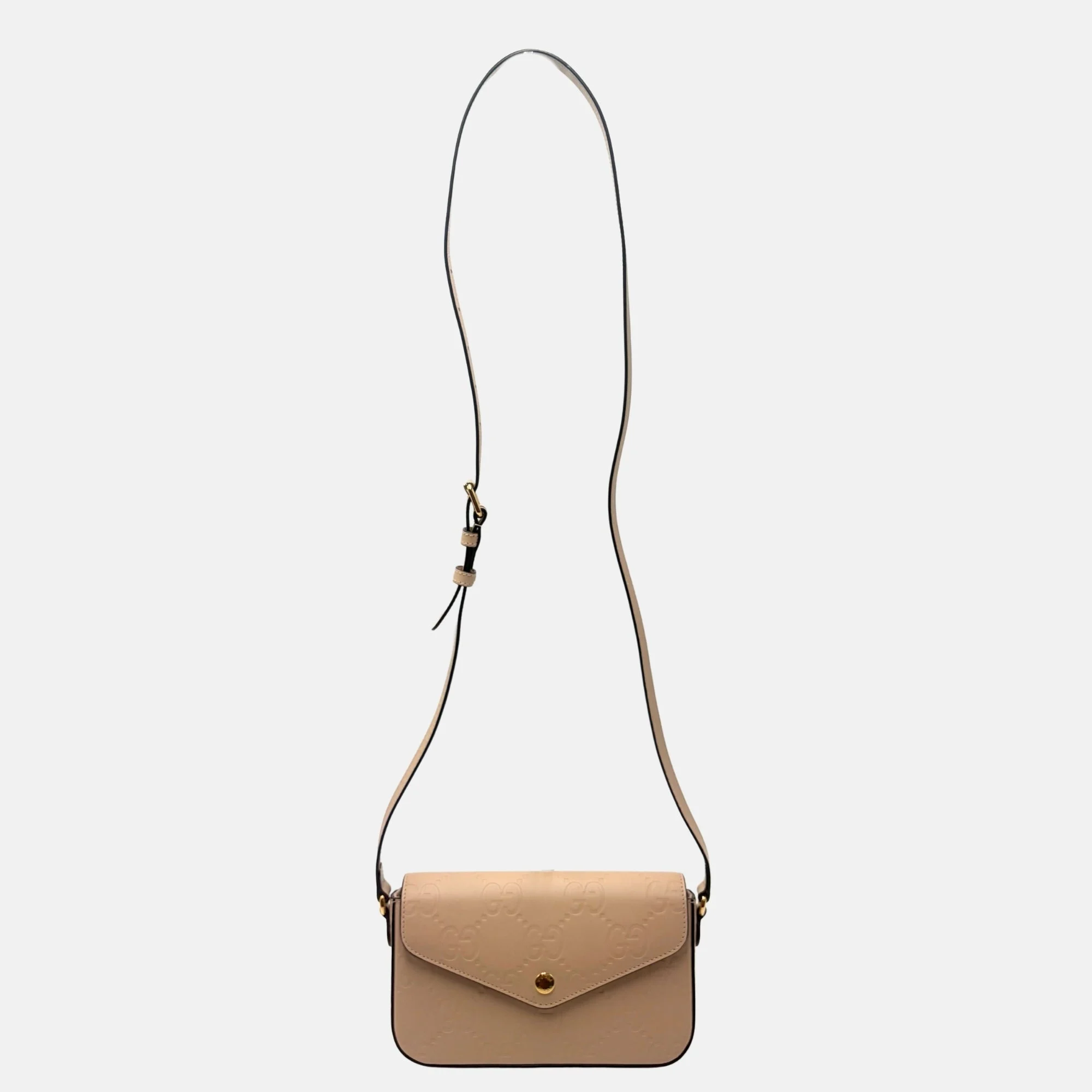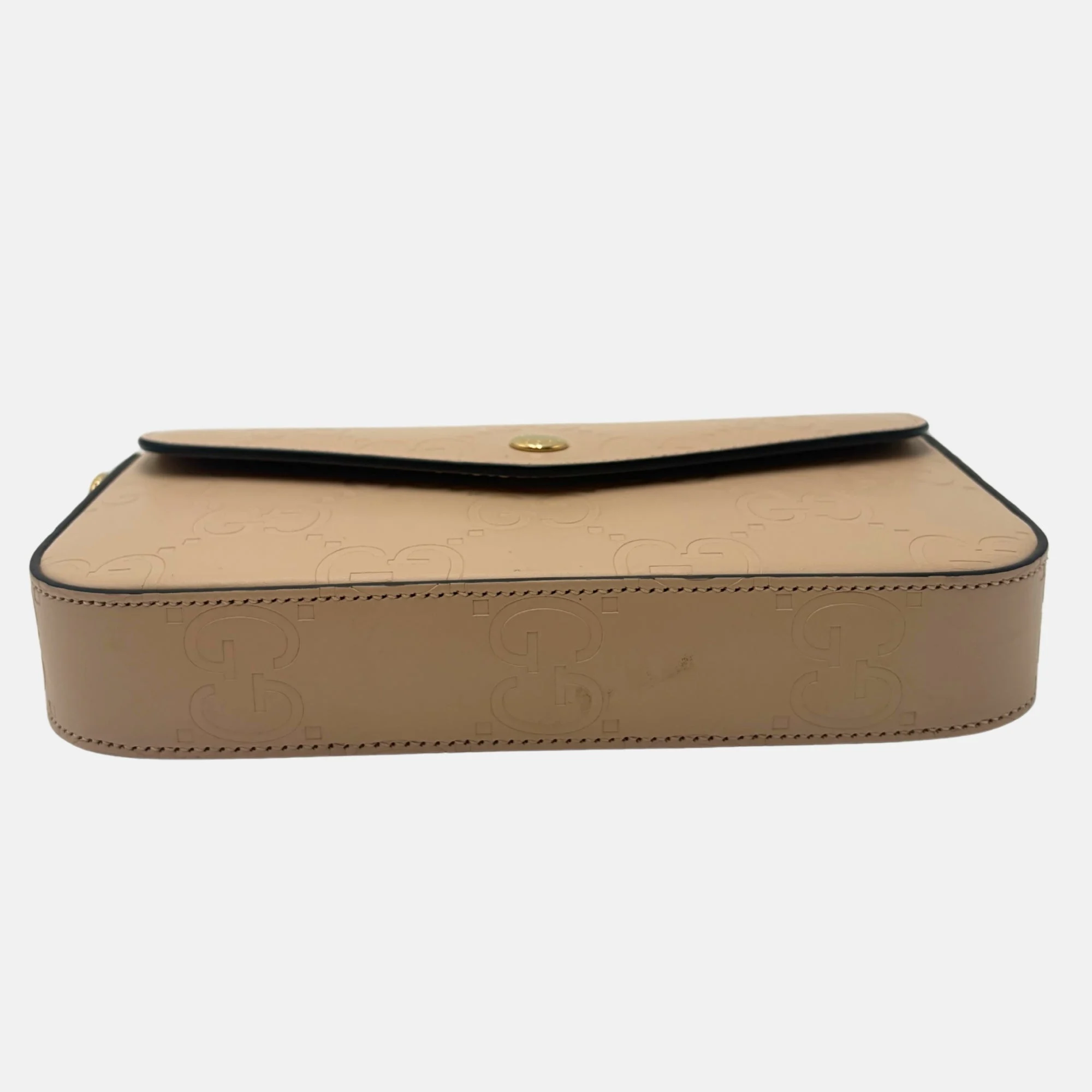This Gucci Super Mini crossbody features the House’s understated Guccissima GG embossed leather in a soft beige tone for a sleek, tonal look. The compact envelope style is finished with a flap front and gold tone hardware, paired with a delicate chain strap for easy day to night wear. Small but polished, it’s designed to carry just the essentials while keeping your outfit clean and elevated.