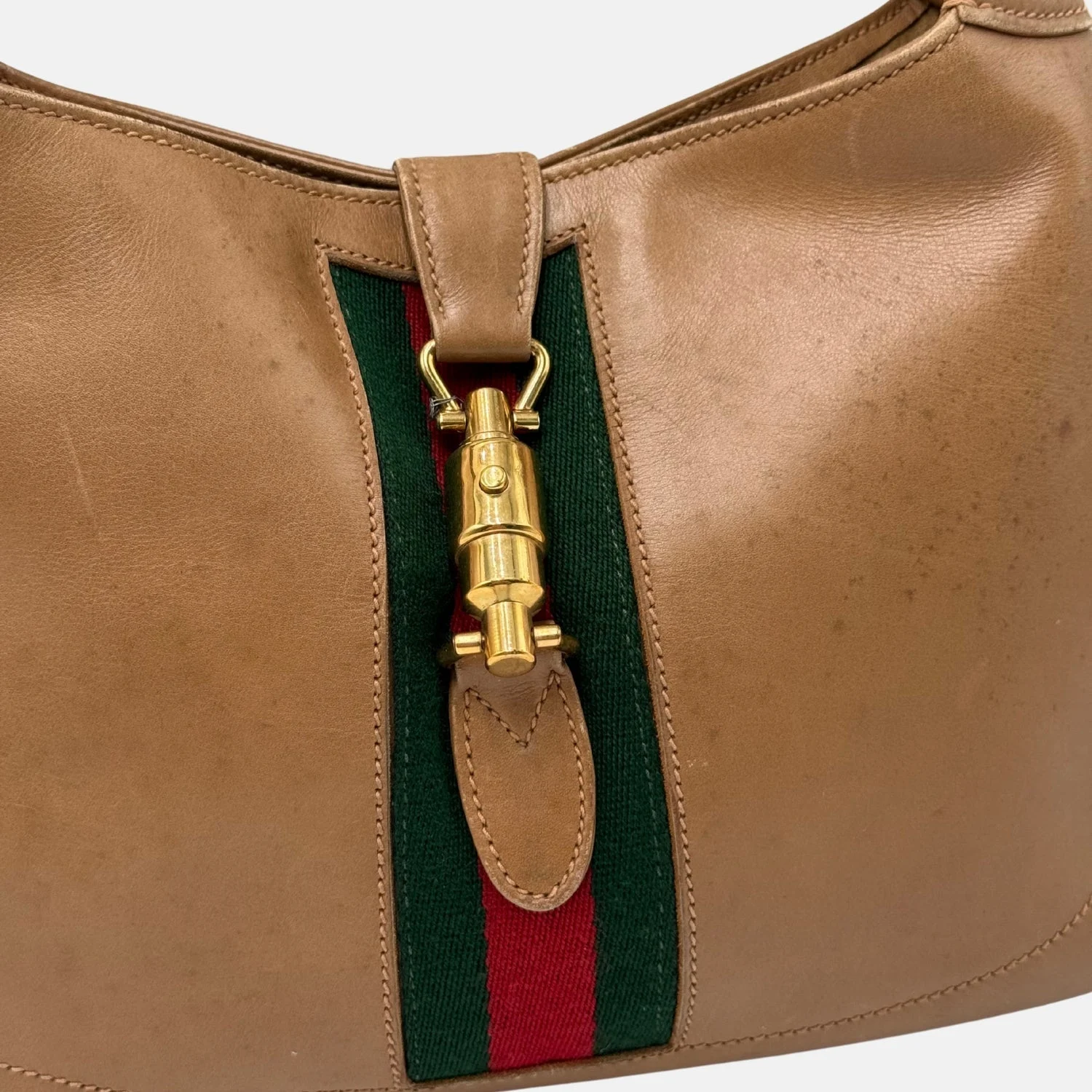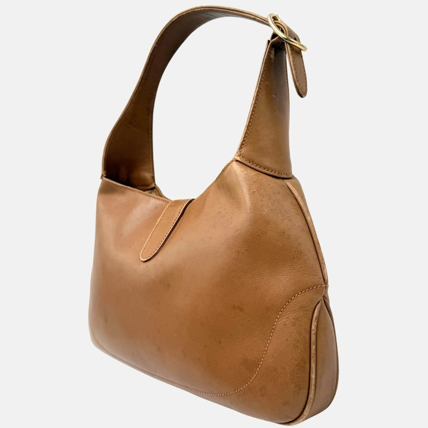 The Gucci Jackie Hobo is an enduring icon reimagined in supple camel leather with signature house details. This version features the hallmark green and red Web stripe down the center and a gold-tone piston clasp closure. The structured yet curved silhouette is complemented by a flat adjustable shoulder strap, making it an elegant choice for everyday wear with vintage charm.