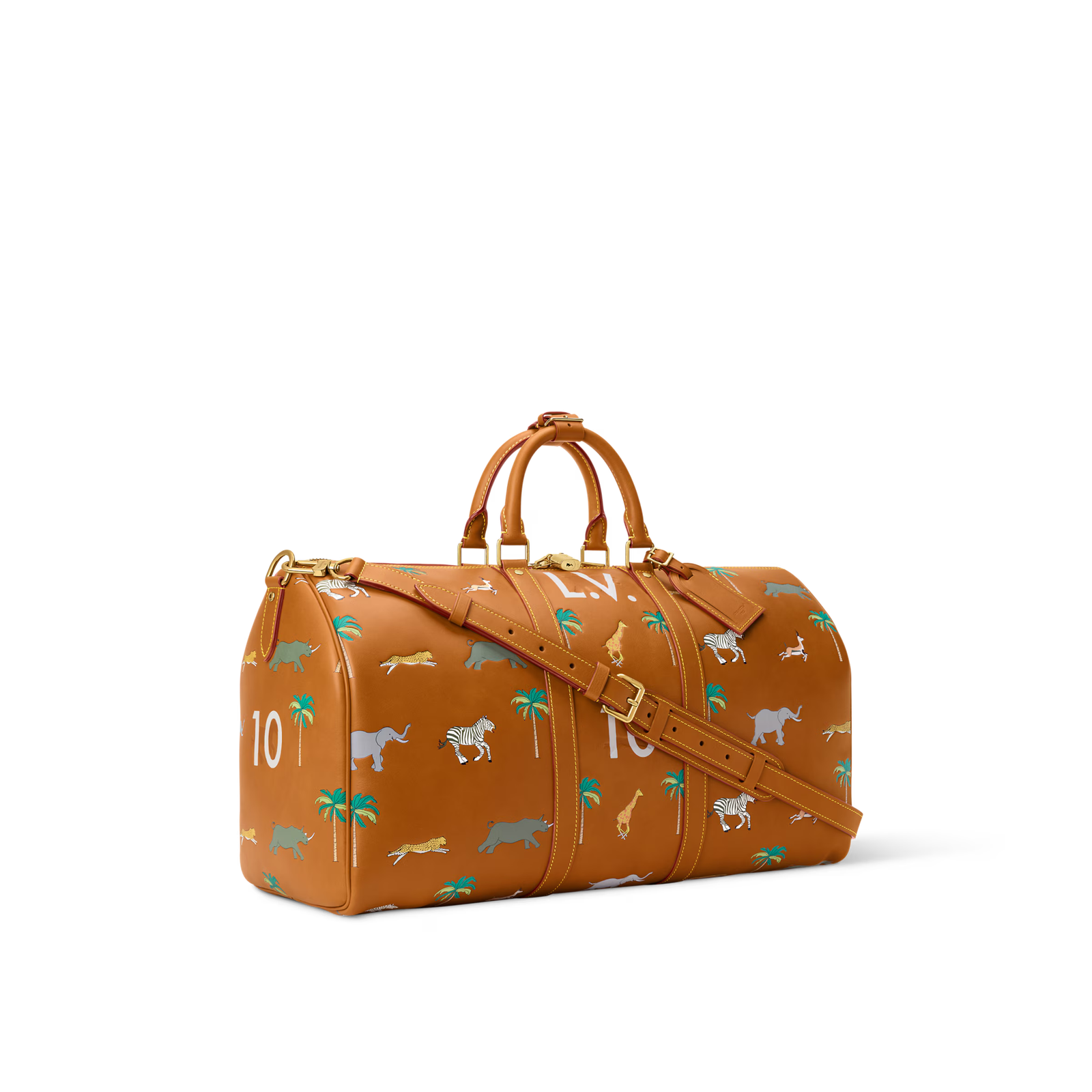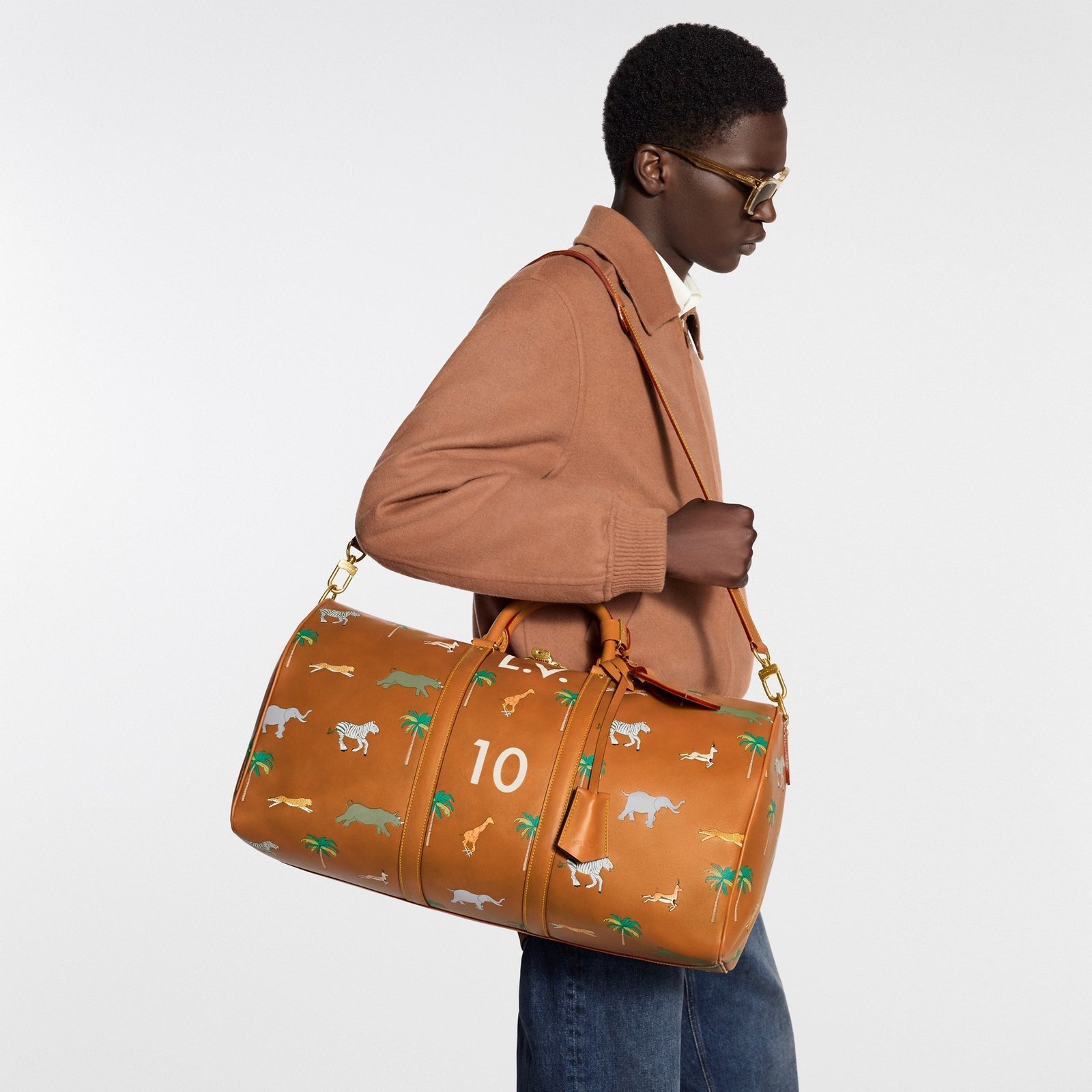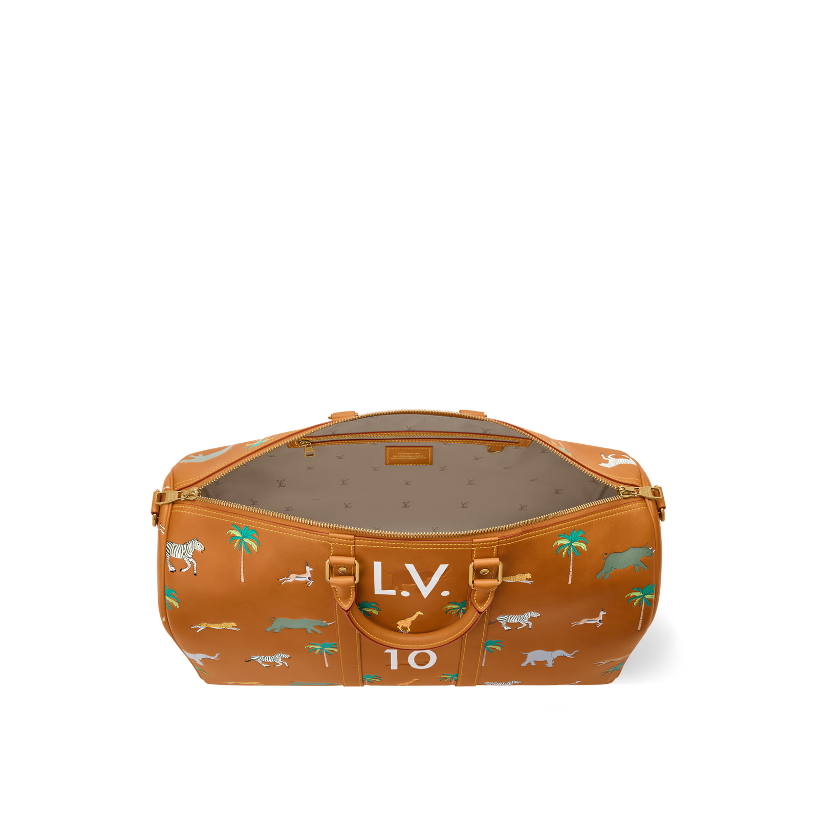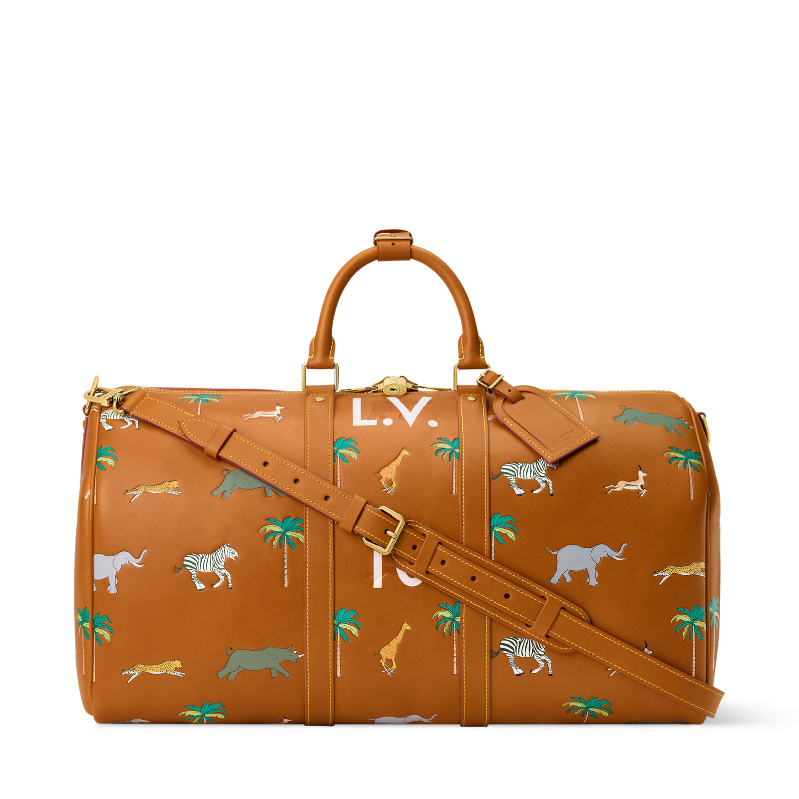 Part of the LV x The Darjeeling Limited Collection, this Keepall Bandoulière 50 bag is crafted from naturally tanned calfskin with a sfumato patina finish that echoes archival leather. Embossed and inkjet-printed exotic animals create a raised effect across the surface. It is signed with the bold Louis Vuitton initials featured in the film.