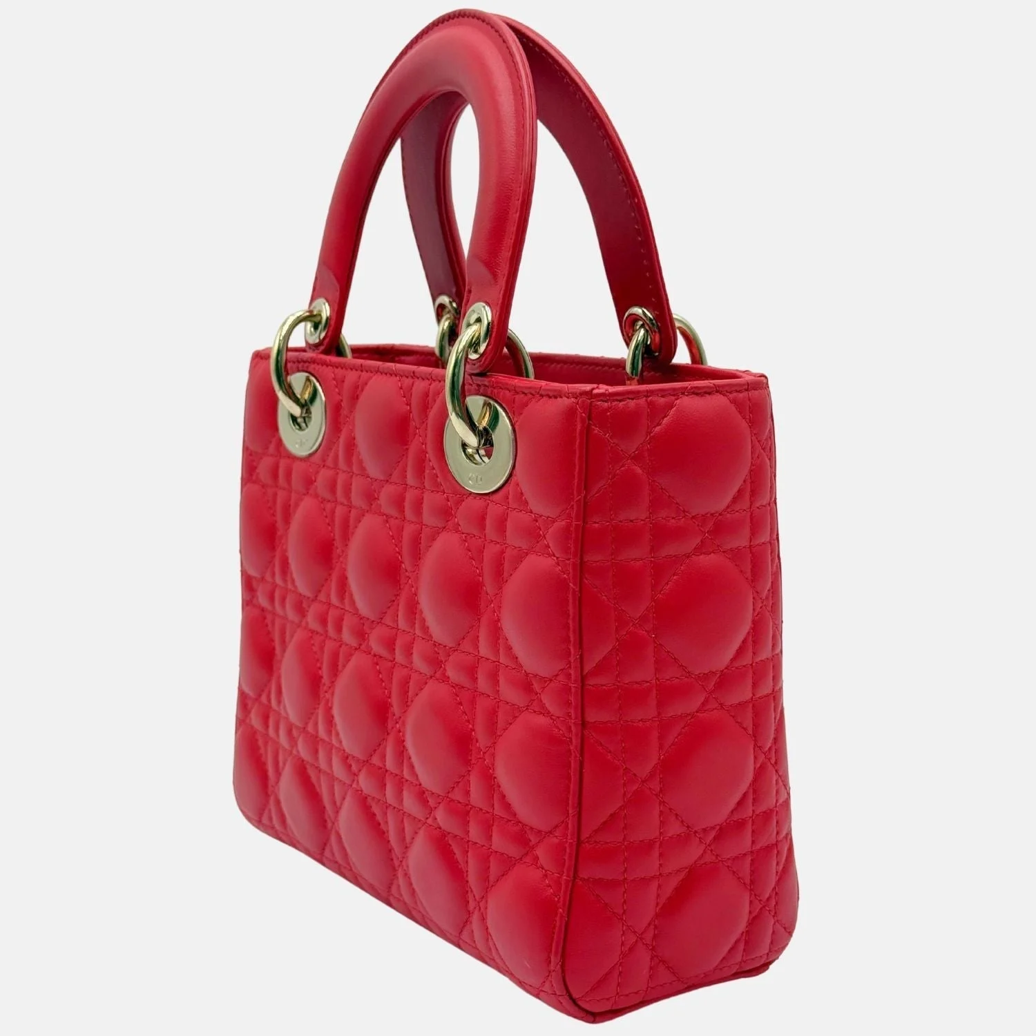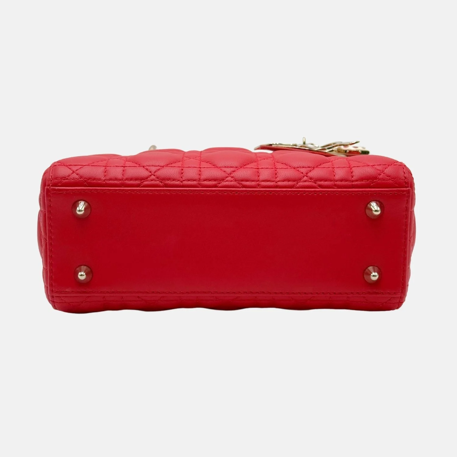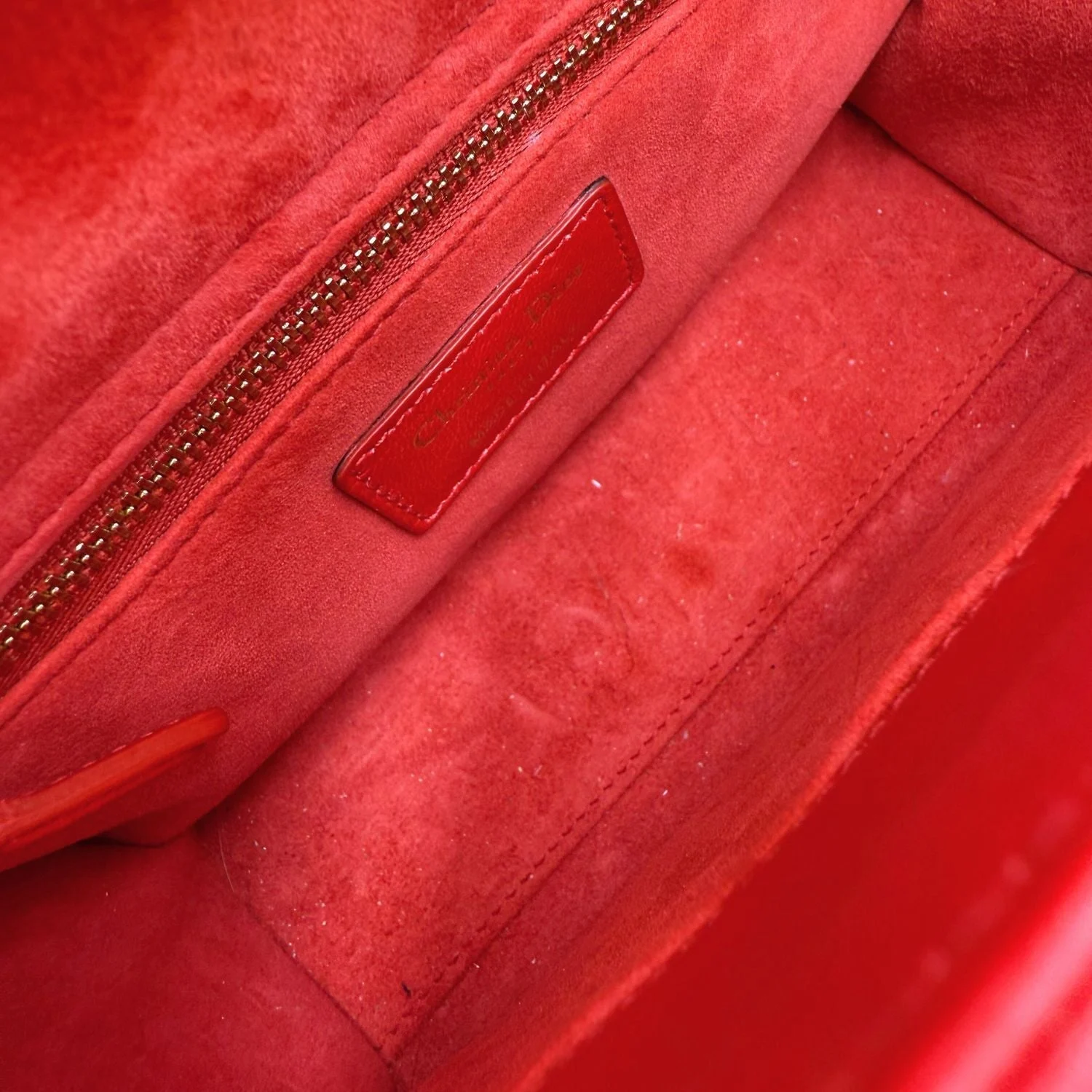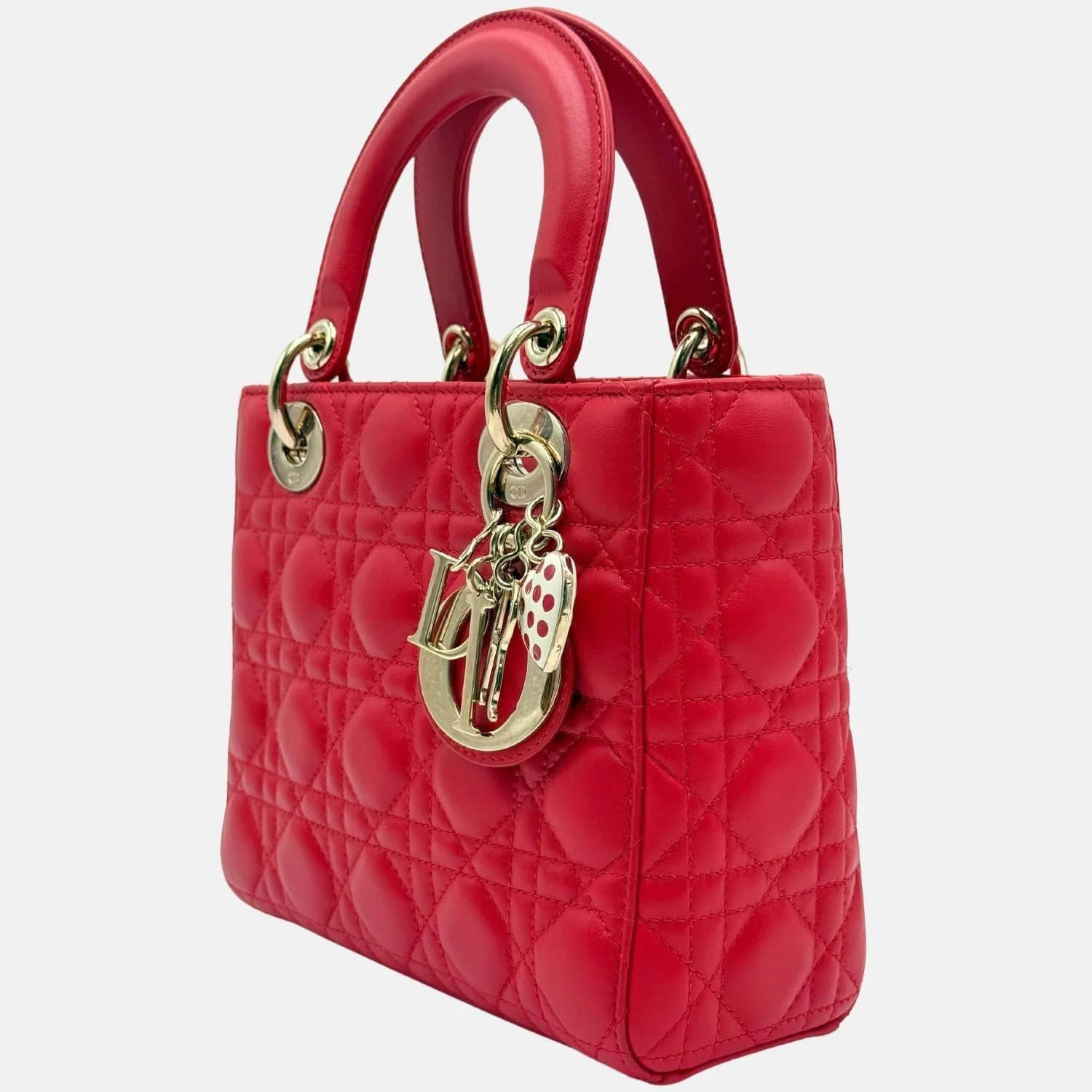 The Lady Dior My ABCDior Red Lambskin Cannage Small is crafted from luxurious red lambskin leather with signature cannage quilting. This elegant tote features rolled and reinforced leather handles, along with a chic shoulder strap that spells “LUCKY” in gold lettering. The front of the bag is adorned with charming heart and Dior charms, adding a playful yet sophisticated touch. The top inner flap opens to a matching red suede interior with a zip pocket and a patch pocket, combining timeless elegance with functional design.
