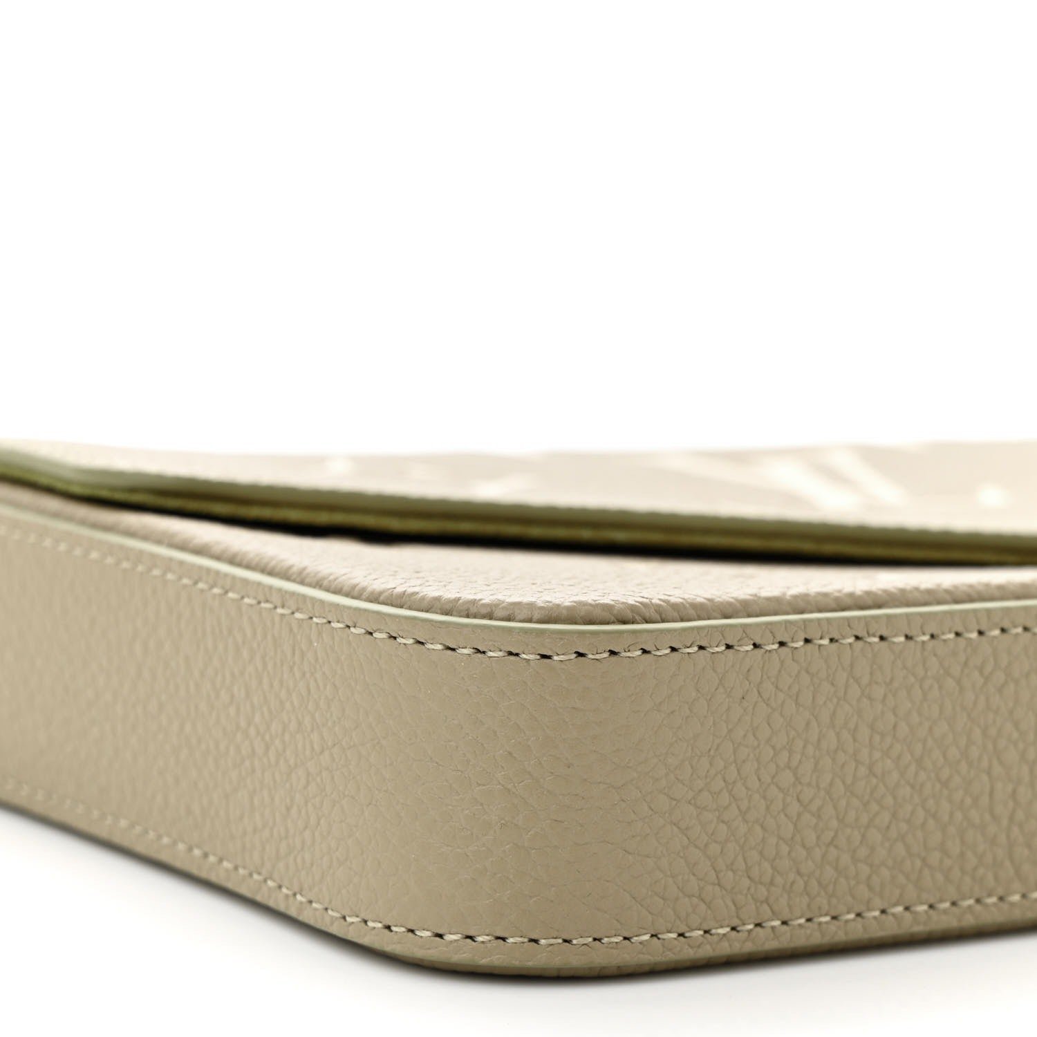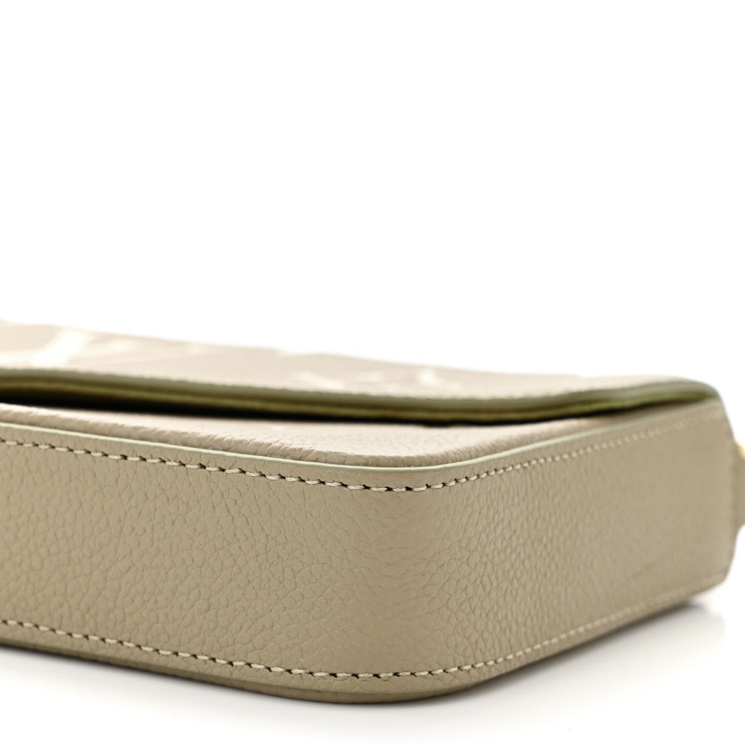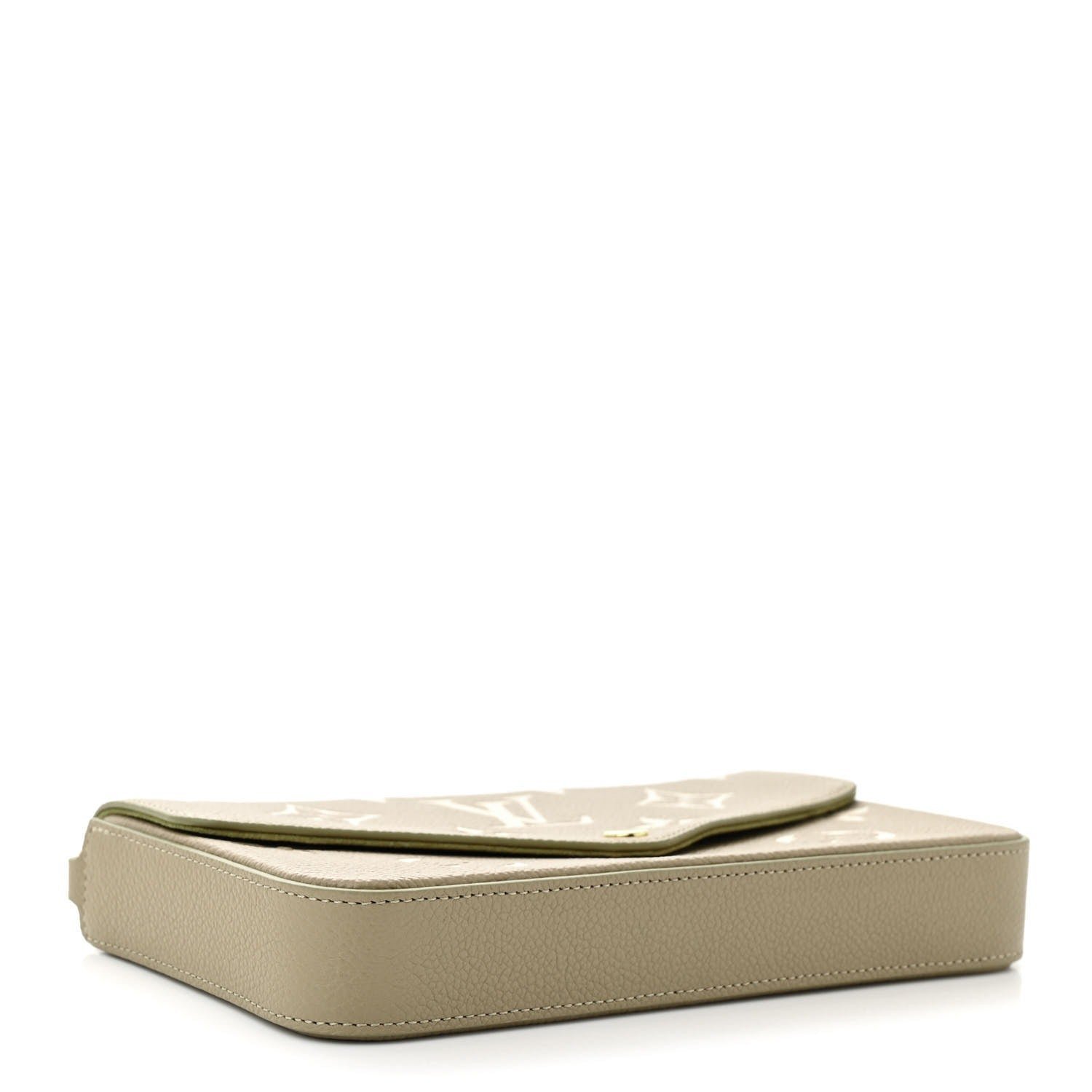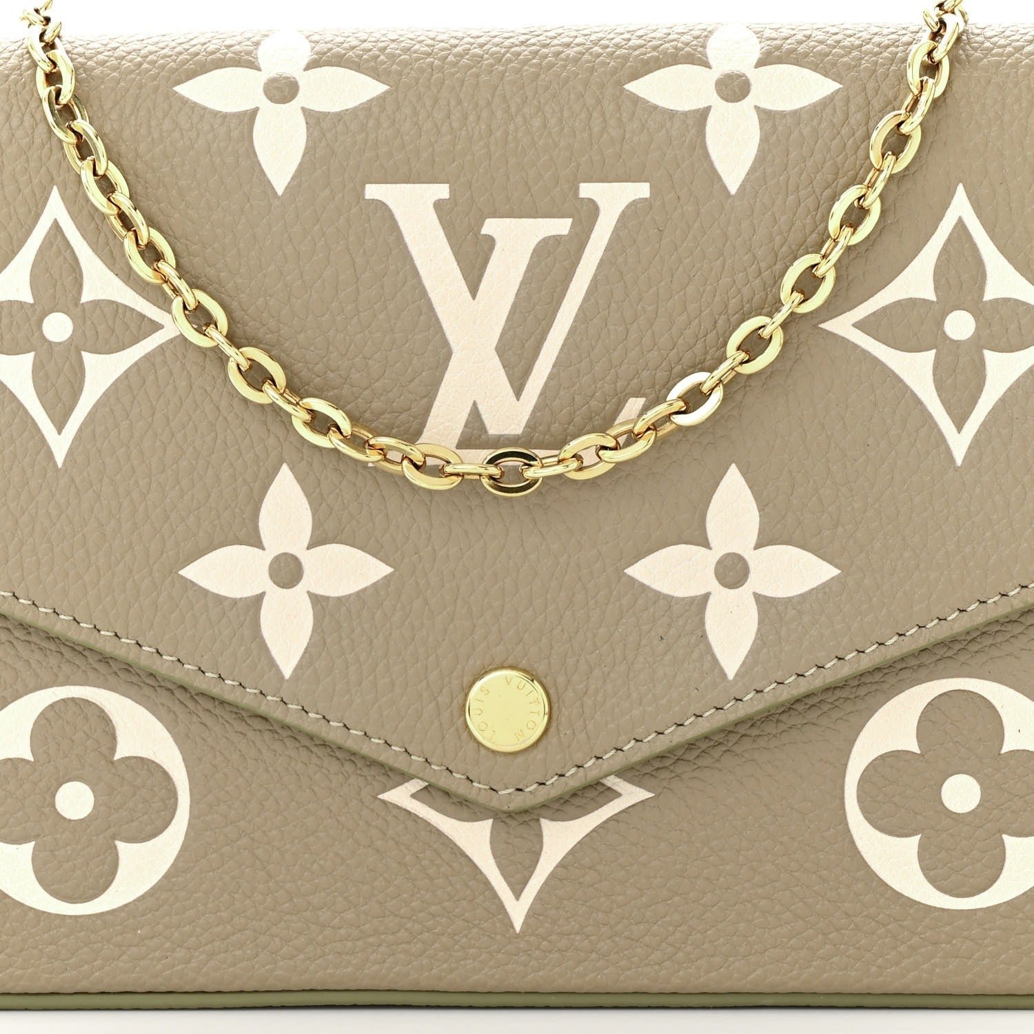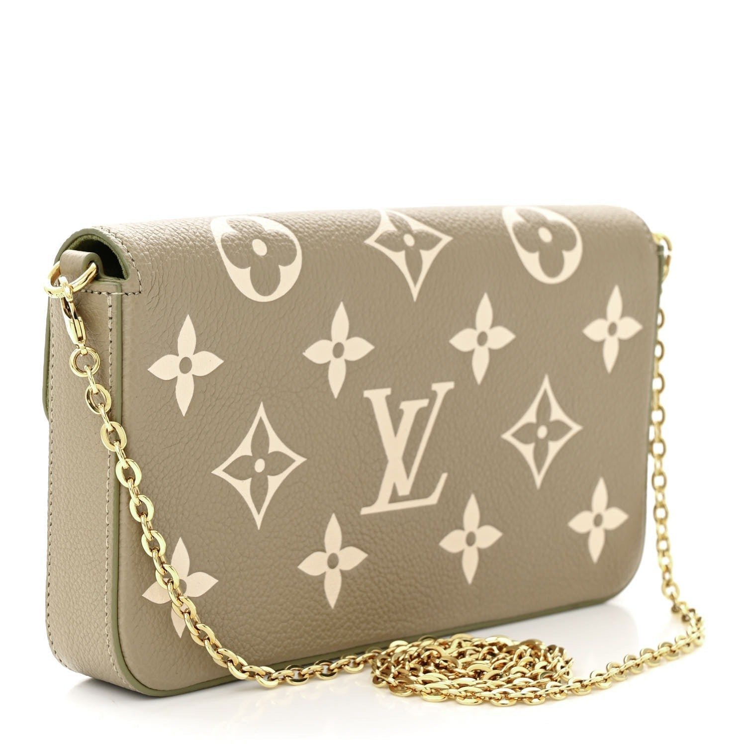 Produced from Tourterelle Gray Monogram Empreinte leather, the Pochette Félicie is Adorned Using a Monogram print at a cream Colour. This fashionable envelope-style pouch comprises two detachable interior pockets. It may be carried as a clutch or worn around the shoulder, as a result of its removable gold-color chain.