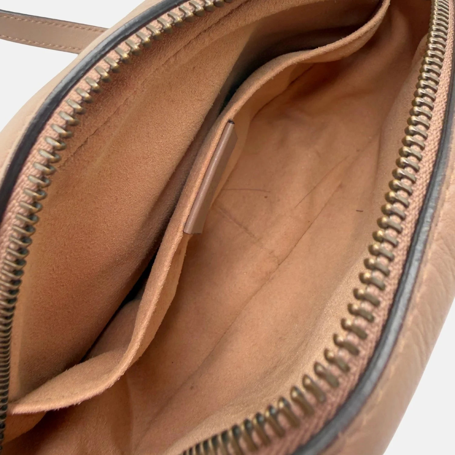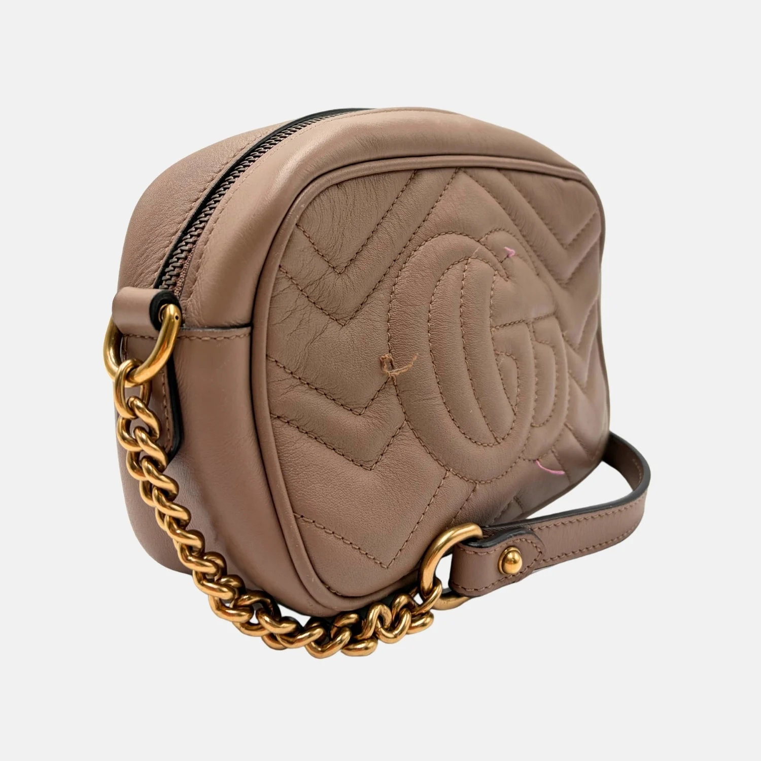 The Gucci GG Marmont Mini Camera Bag is crafted in soft taupe matelassé leather with the signature chevron pattern and interlocking GG logo in antique gold-tone hardware. Featuring a compact, softly structured silhouette, this versatile piece is finished with a zip closure and adjustable shoulder strap for effortless, everyday wear.