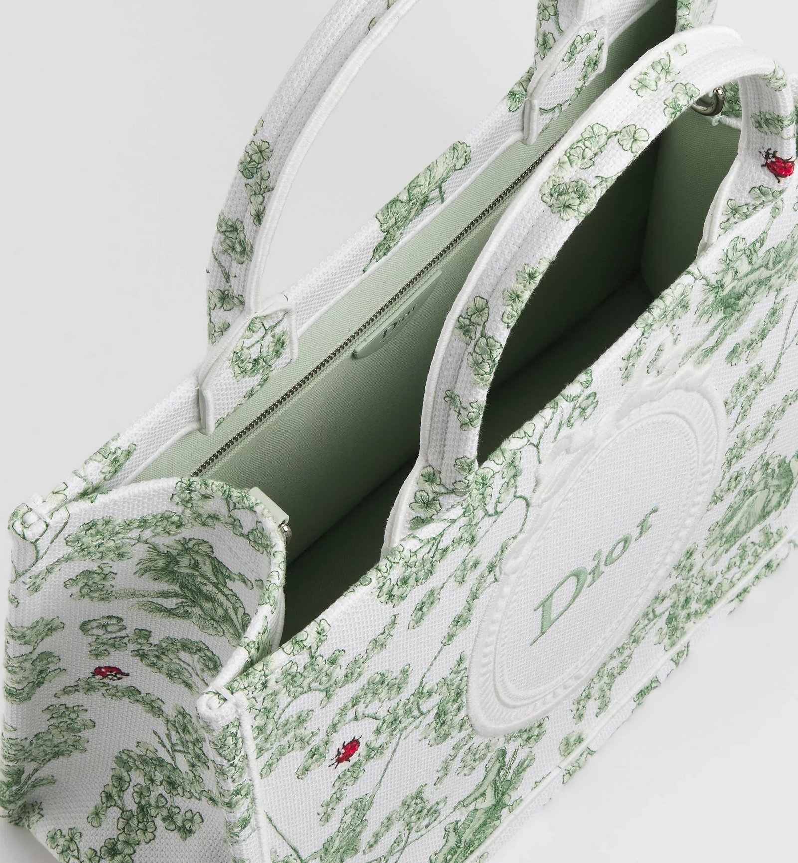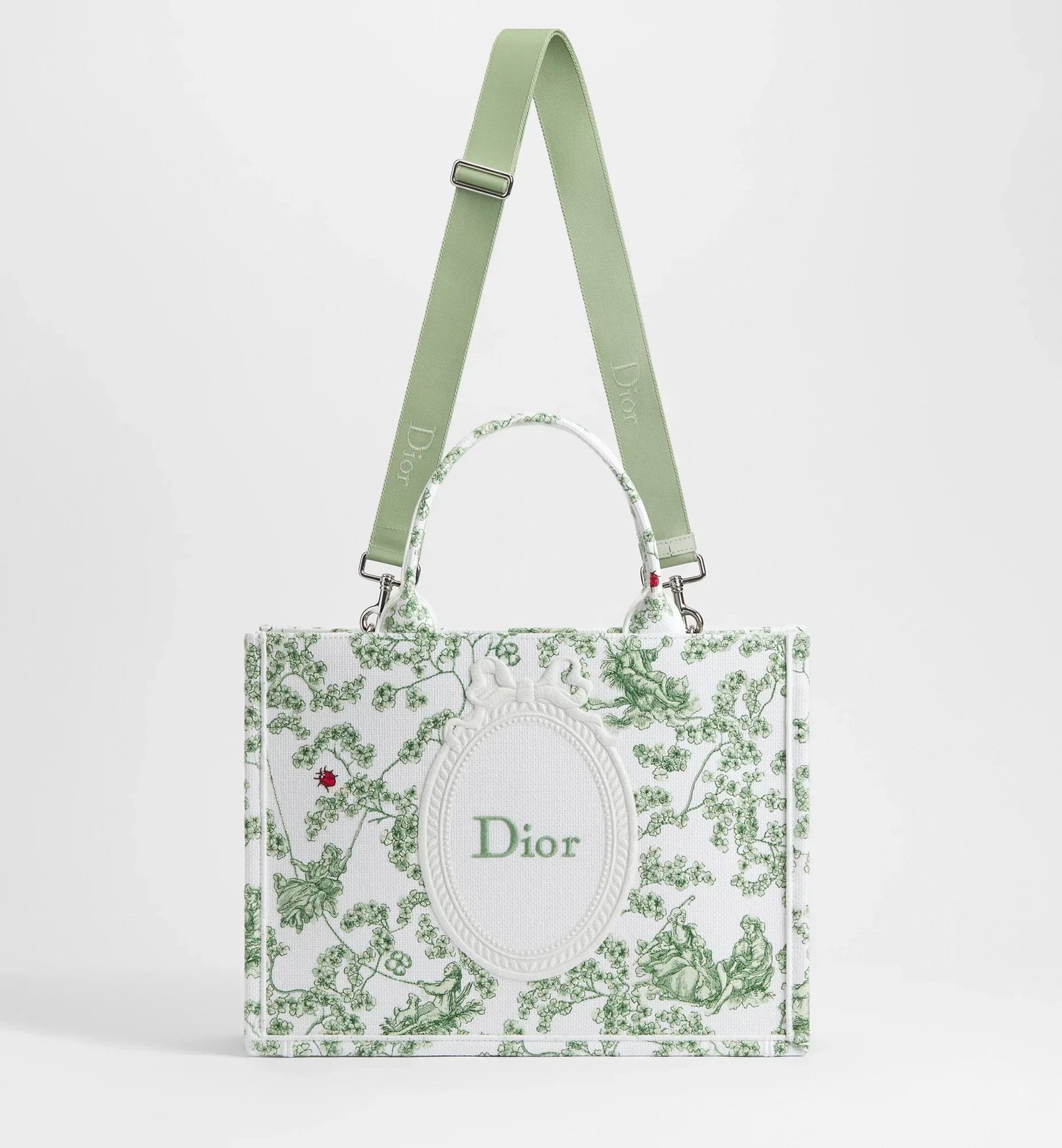 The hallmark Dior Book Tote features the Toile de Jouy Clover motif, showcasing an 18th-century-inspired motif adorned with clovers and ladybugs for a light and fresh touch. Complete with the Dior Médaillon signature, the medium style offers a practical design that can be carried by hand, worn over the shoulder or crossbody.