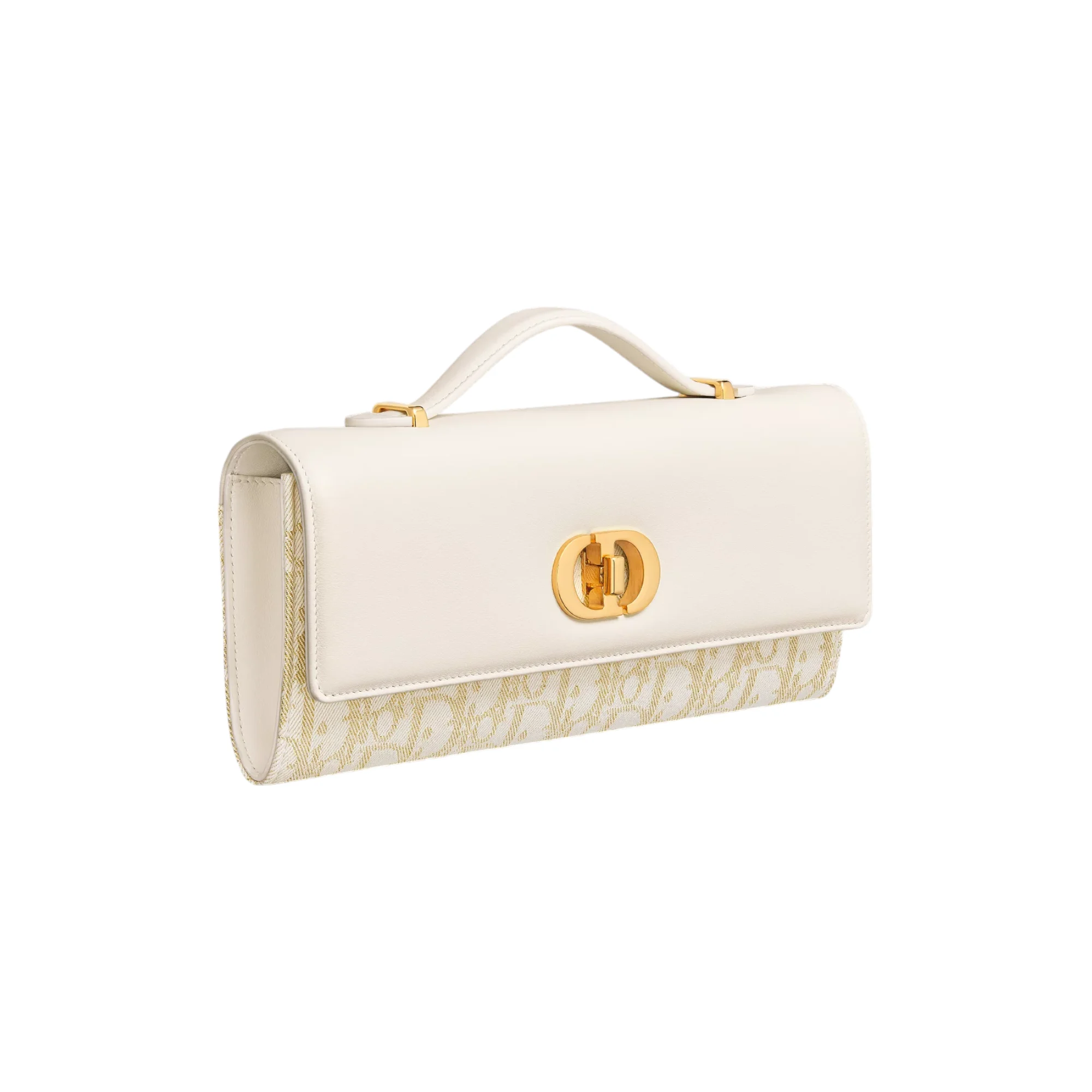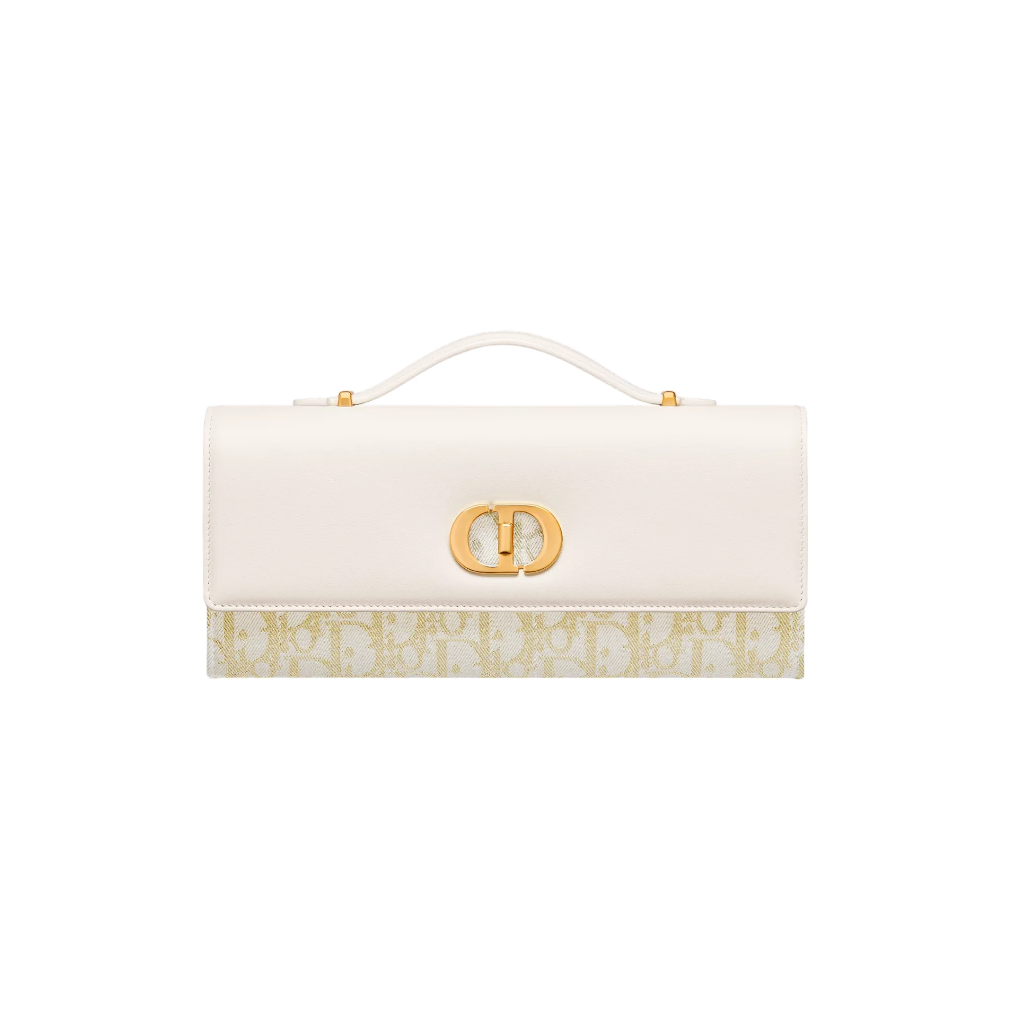 New for Cruise 2025, the 30 Montaigne Top Handle pouch is a must-have with sophisticated appeal. Pairing gold-tone Dior Oblique jacquard with white smooth calfskin, it features a flap accented by an antique gold-finish metal CD signature, opening to reveal a compartment that will accommodate all the essentials. Equipped with a foldable top handle allowing it to be carried by hand, the creation will elevate refined looks.