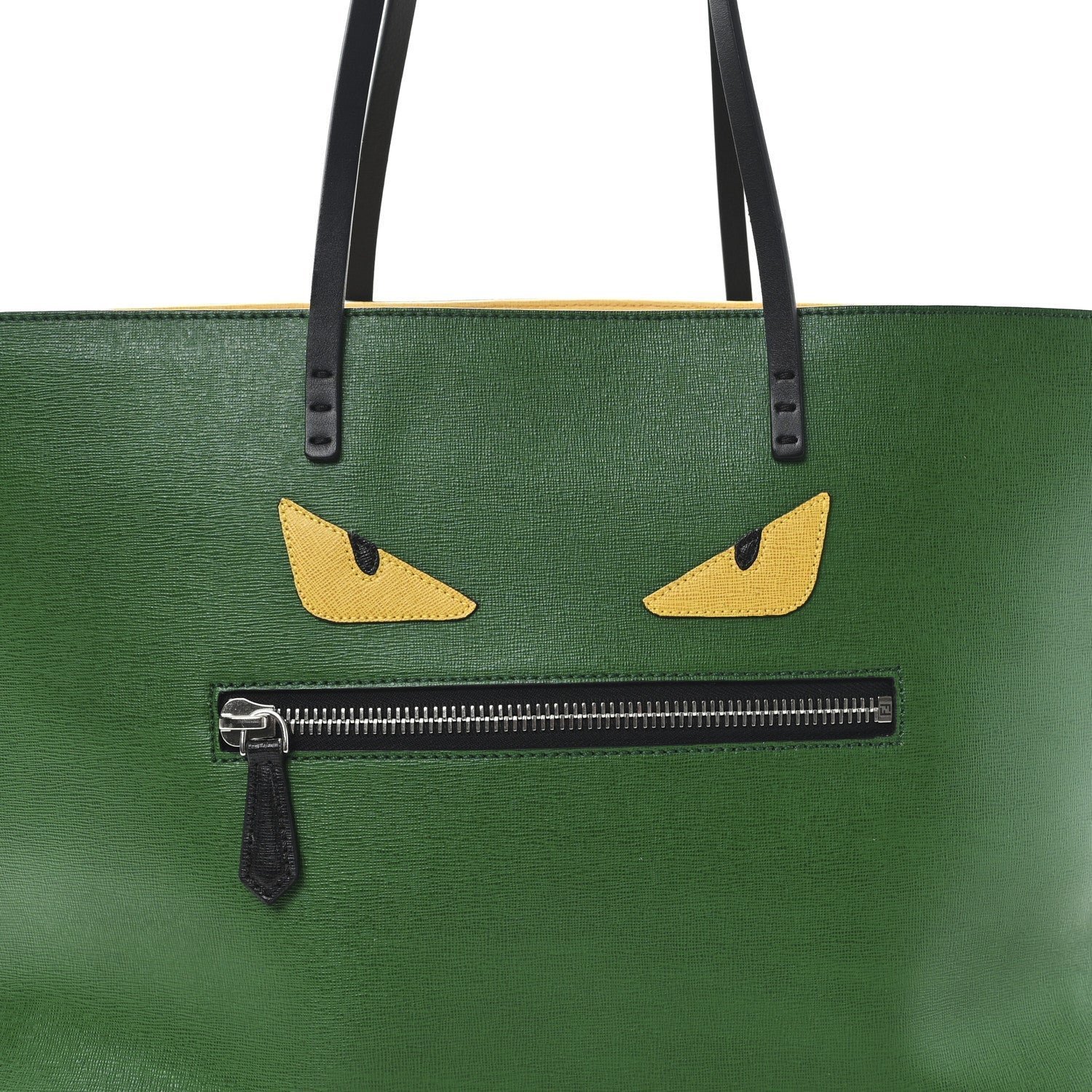 This functional and vibrant shopper bag features the iconic “Monster Eyes” motif, a hallmark of the Fendi Bag Bugs line. Crafted from Emerald Green Vitello Elite leather a premium, textured calfskin known for its durability and cross-hatch finish similar to saffiano the bag offers a structured yet lightweight silhouette.
