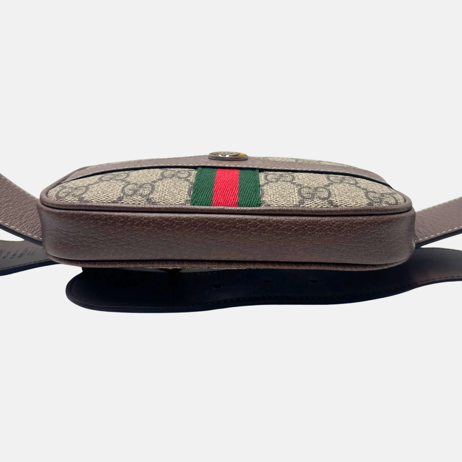 The Gucci Ophidia GG Supreme Belt Bag is crafted in beige and ebony GG Supreme canvas with brown leather trim and finished with gold-tone hardware. Featuring the house’s signature green and red Web stripe and Double G logo detail, this compact design blends archival motifs with a modern, functional silhouette.