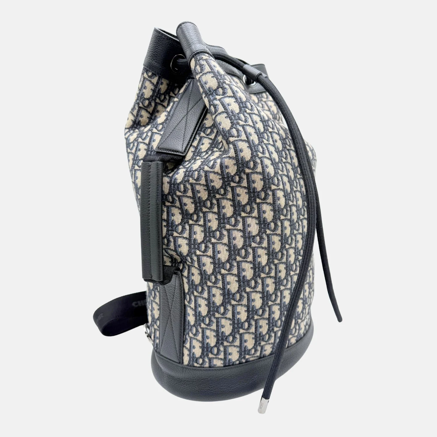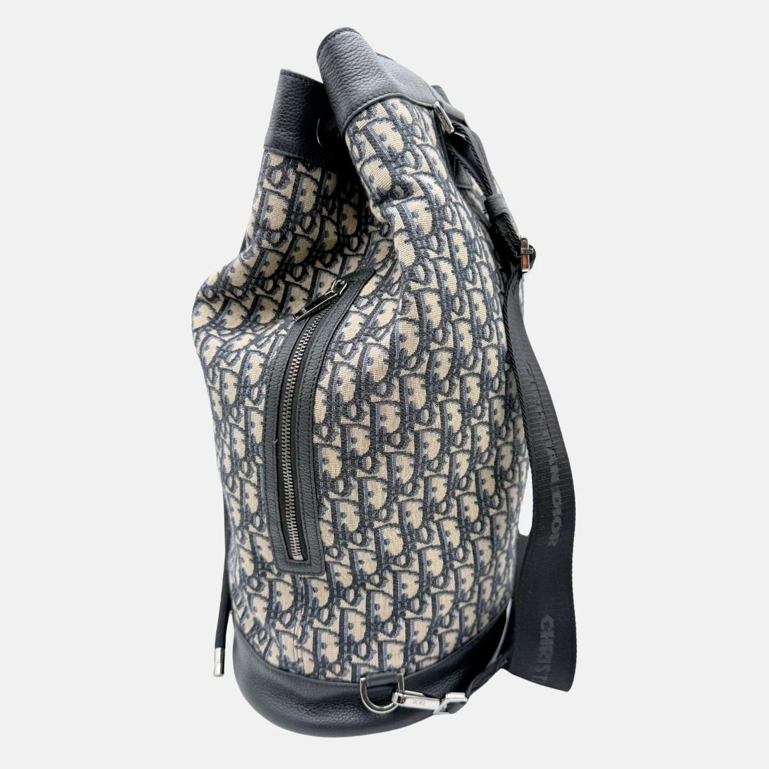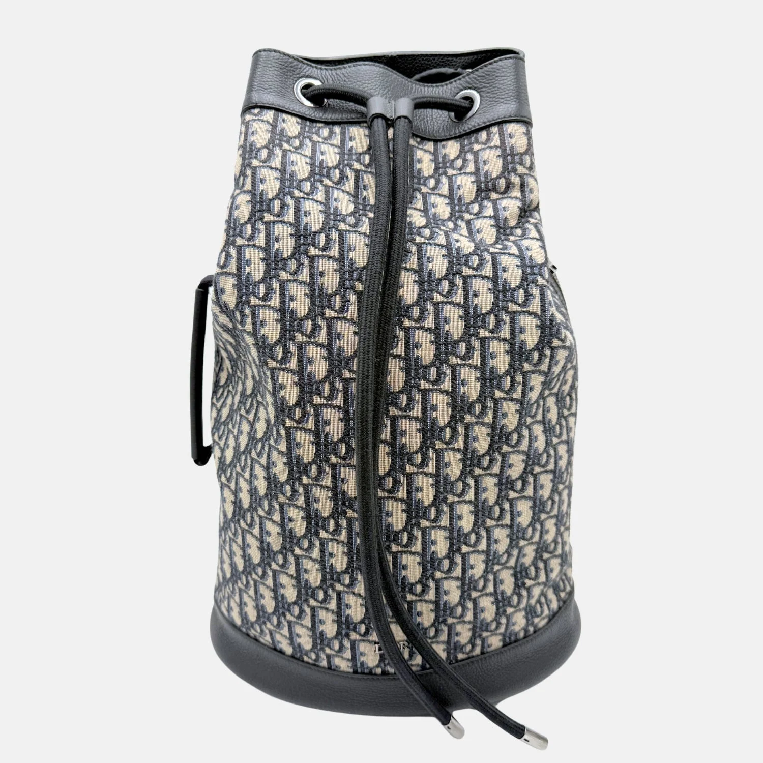 This is an authentic Christian Dior Oblique Convertible Drawstring Sling Bucket Backpack. Crafted from signature Dior Oblique fabric with smooth black leather accents, this versatile bag offers both style and functionality. It features a drawstring closure at the top with an additional nylon drawstring for extra security, an adjustable nylon strap for multiple carrying options, a sturdy top handle, and silver-tone hardware. A convenient side exterior zip compartment provides additional storage. The spacious interior, lined in black fabric, includes a large patch pocket for easy organization.