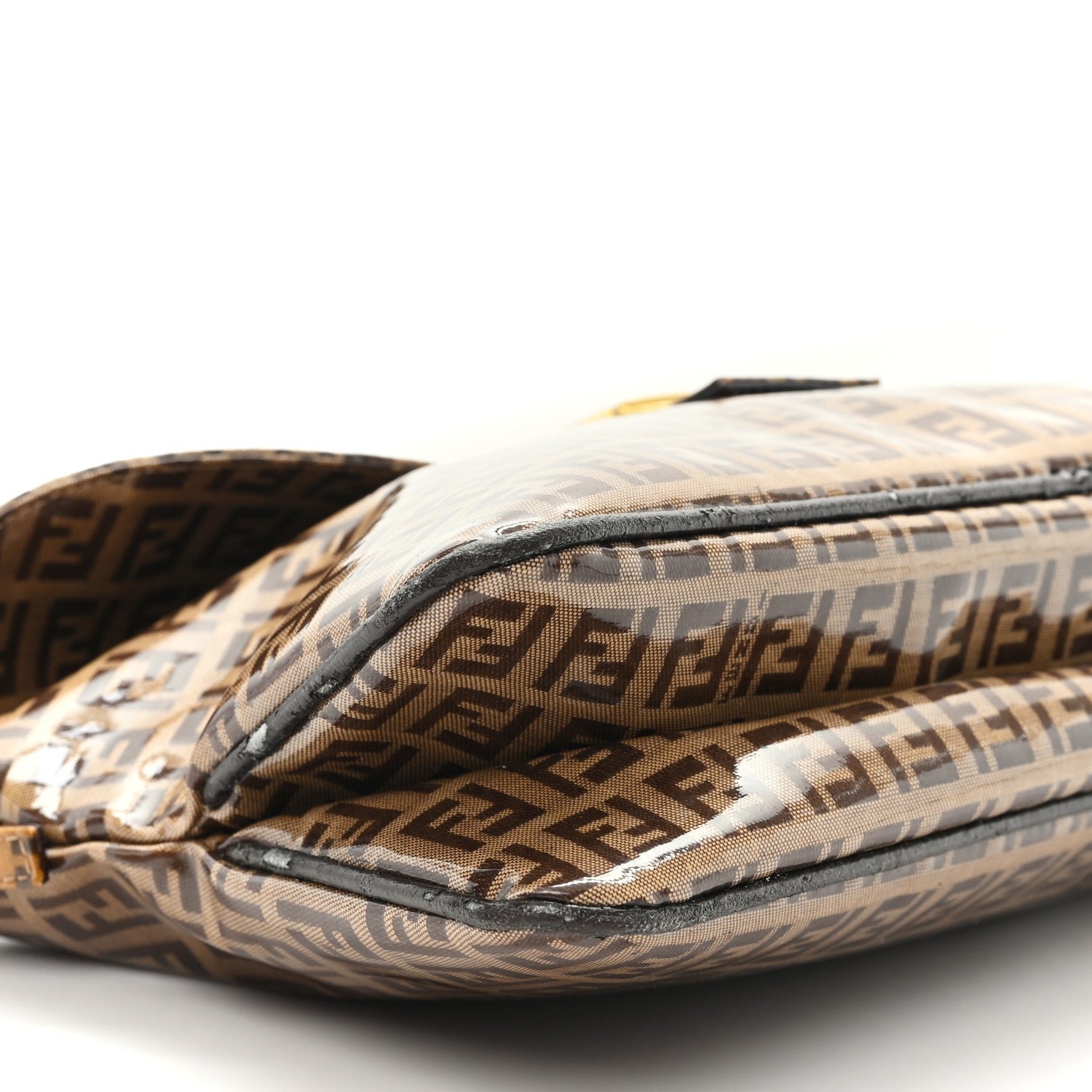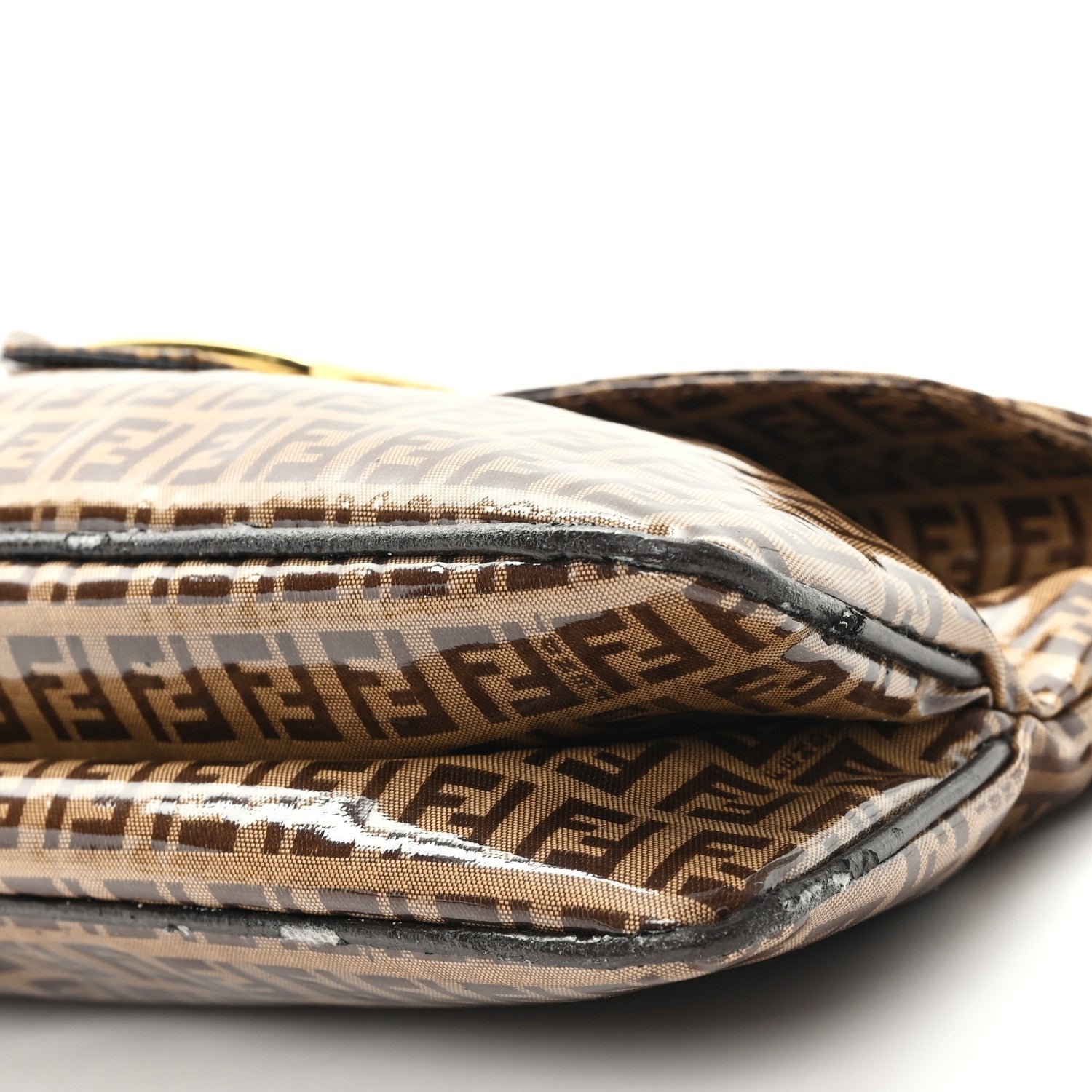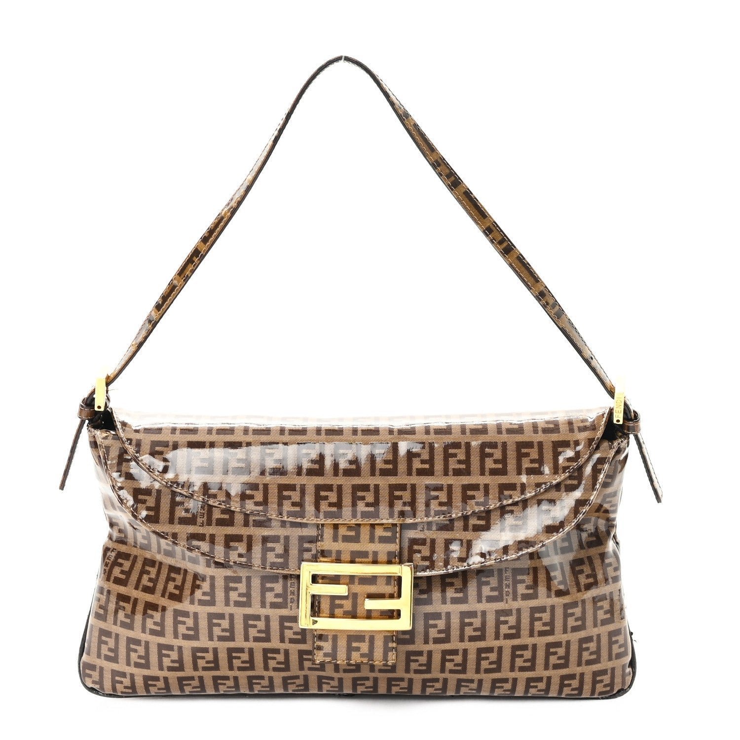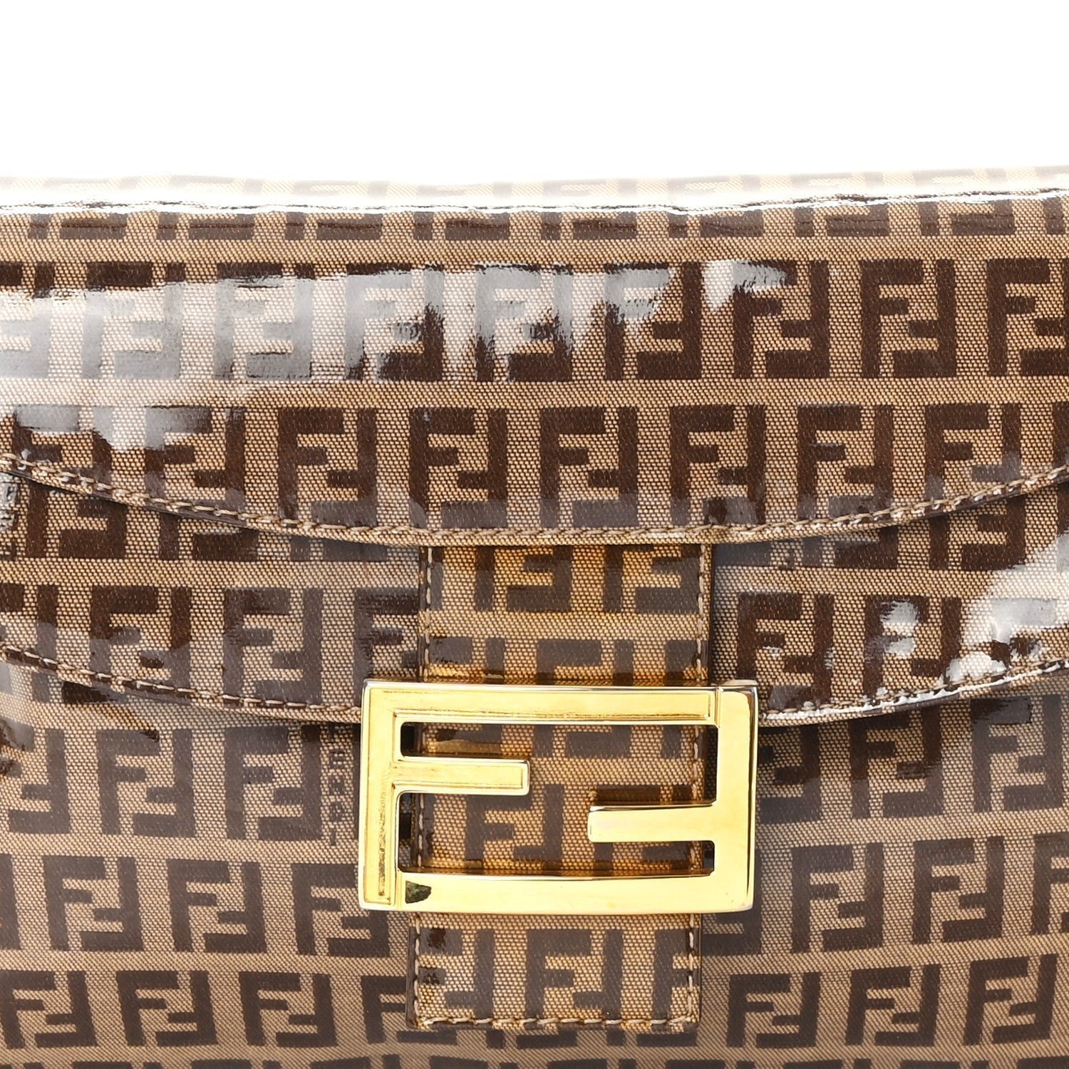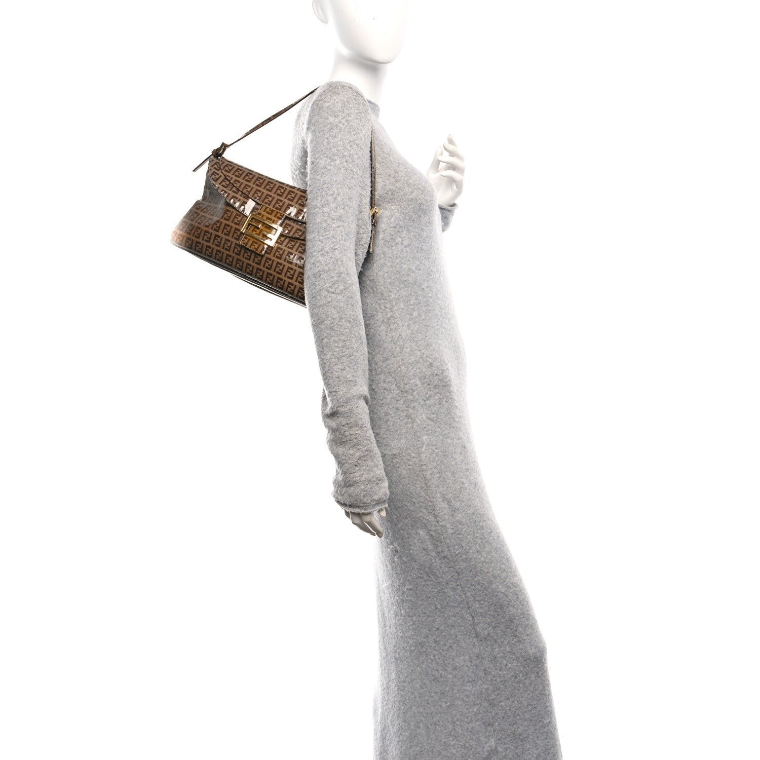 This rare and stylish baguette is a contemporary twist on the first-ever “It” bag. It is meticulously crafted from Fendi FF Zucchino canvas in tobacco brown, which is entirely encased in a clear vinyl protective layer for a sleek, glossy effect and added durability.